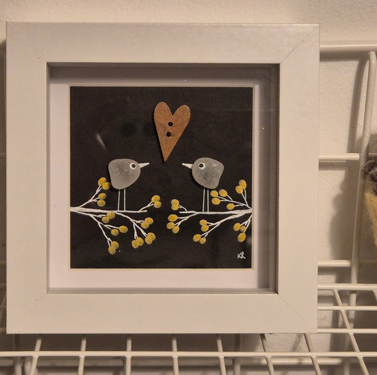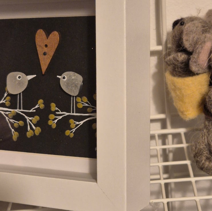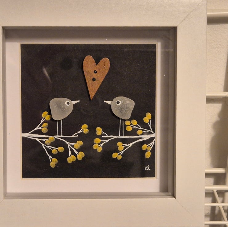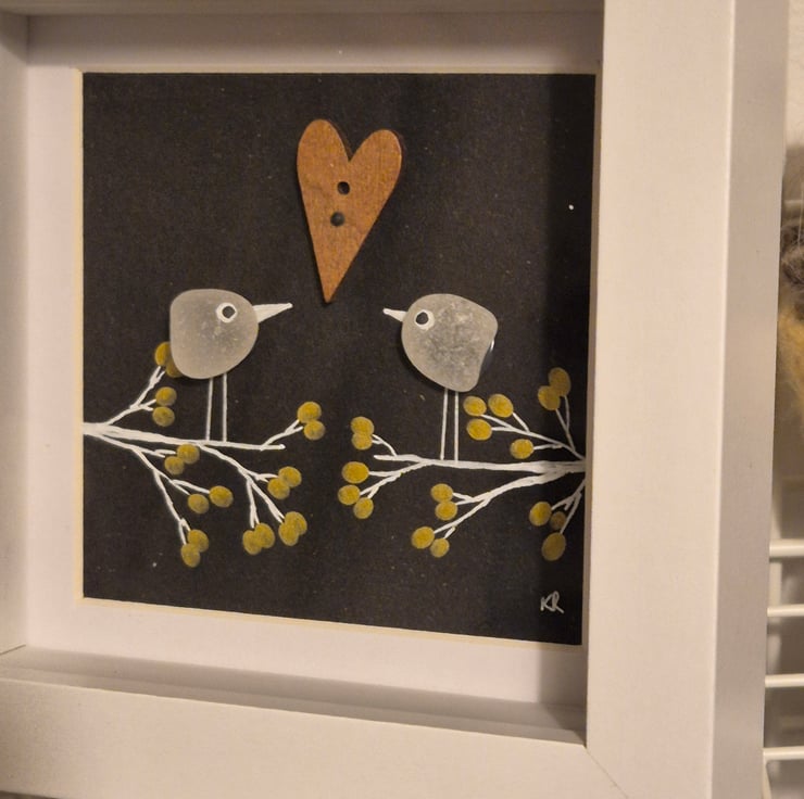 Lovely little handmade love birds in white frame, seaham sea glass with heart