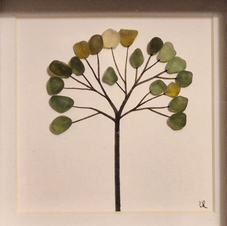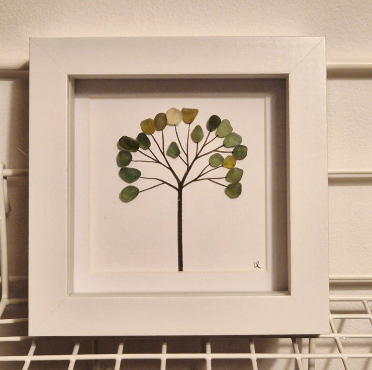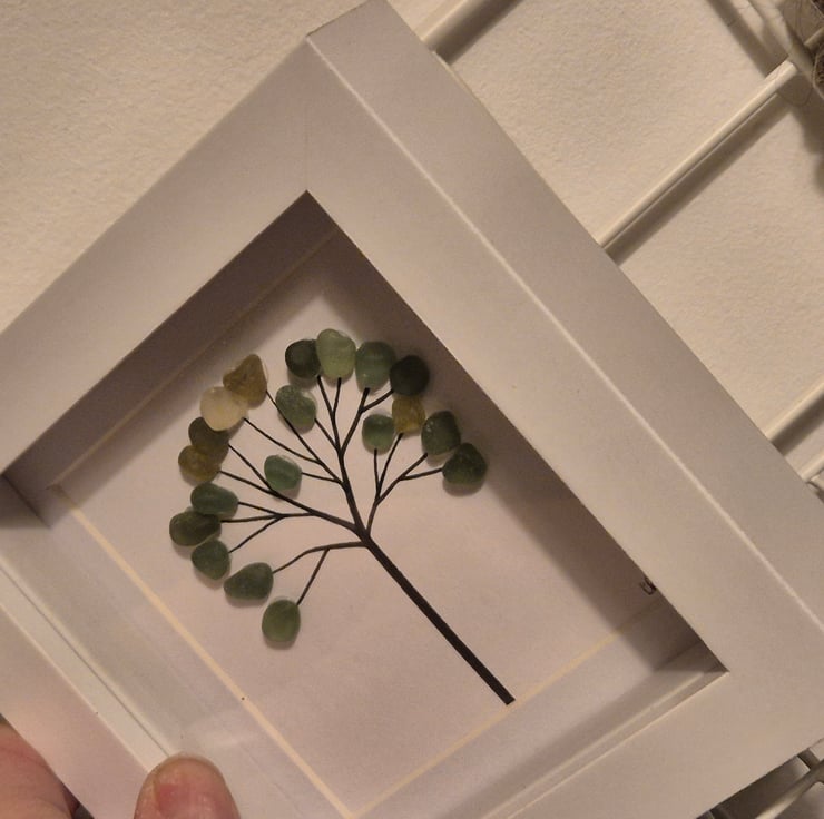 Simple sea glass tree in mini 12cmx12cm shadow box frame shades of green seaham