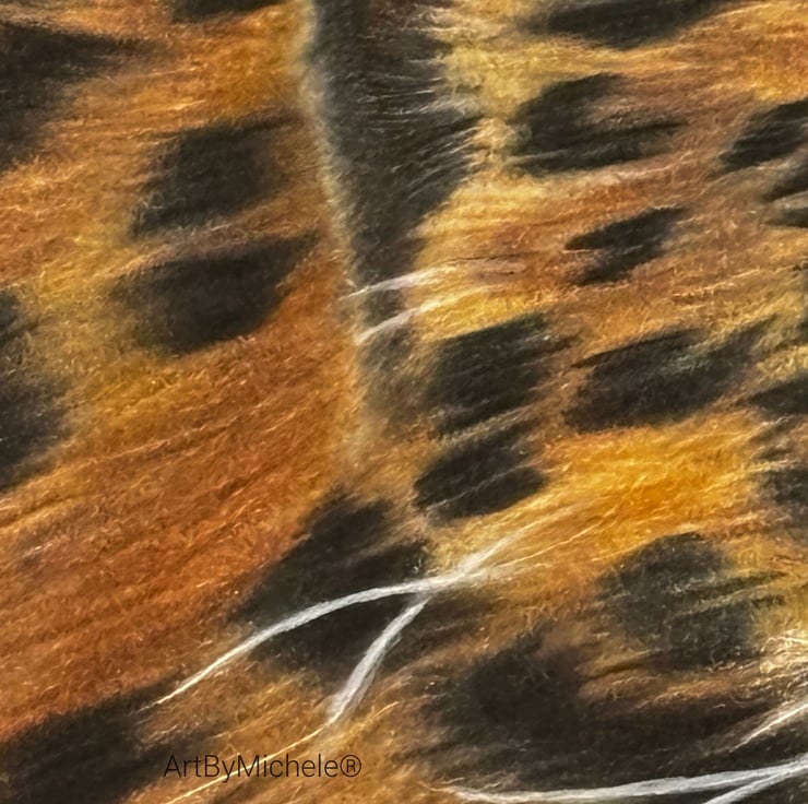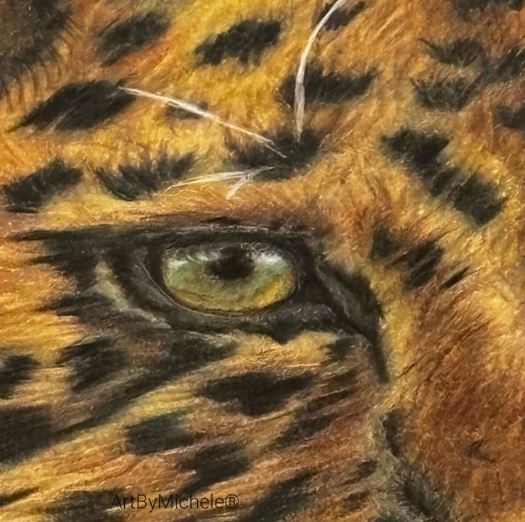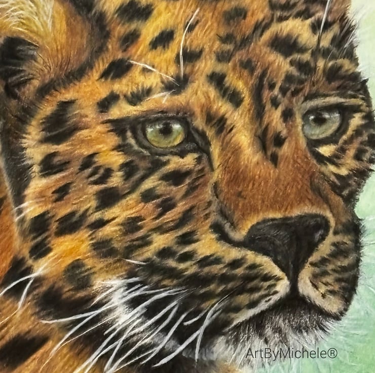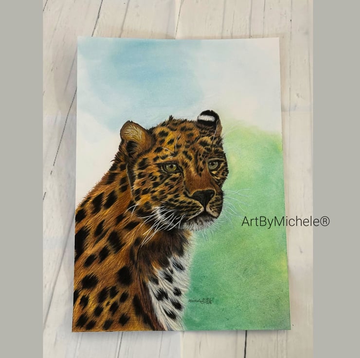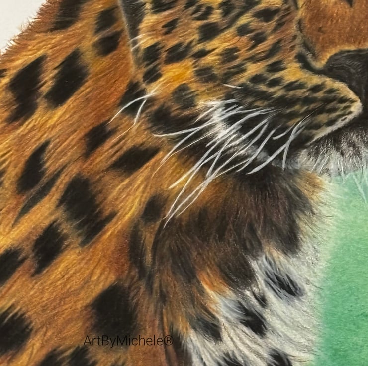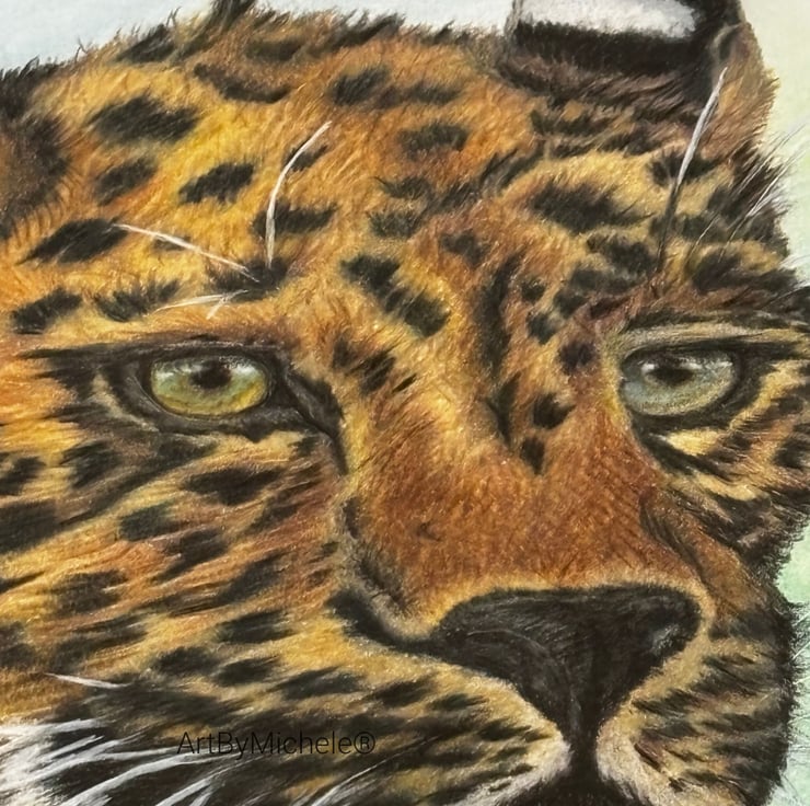 The leopard is set against a softly blurred pastel background, allowing the rich tones and intricate markings of the fur to take centre stage. I used fine layers of coloured pencil to build depth, texture and realism, particularly around the eyes and facial features, which draw you into the piece.