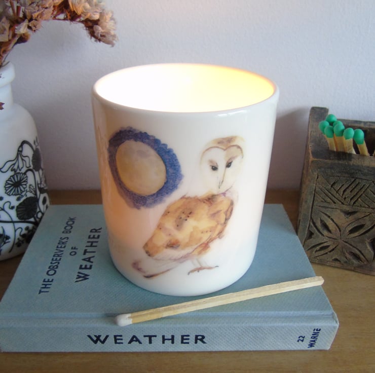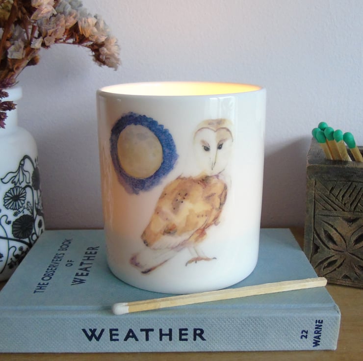 An elegant bone china, tea light holder featuring my illustration of a watchful barn owl under a full moon.