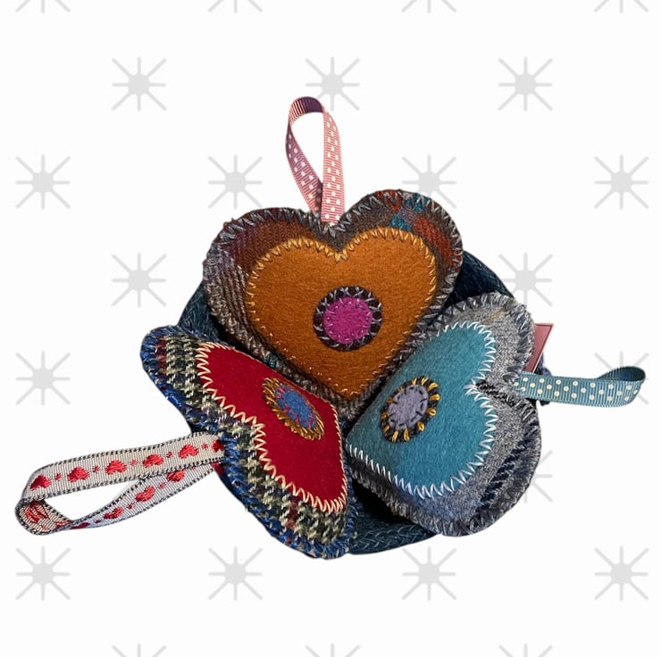My inspiration for my embroidered hearts and other hand stitched and embroidered products is my love of Textiles Folk Art artefacts and creations. Using traditional methods of hand stitching and embroidery, alongside working with fabrics such as wool felt and wool Tweed, I aim to create a modern product reflecting traditional skills and techniques.