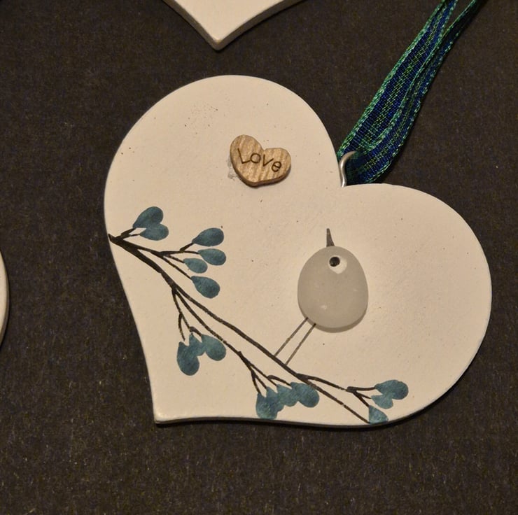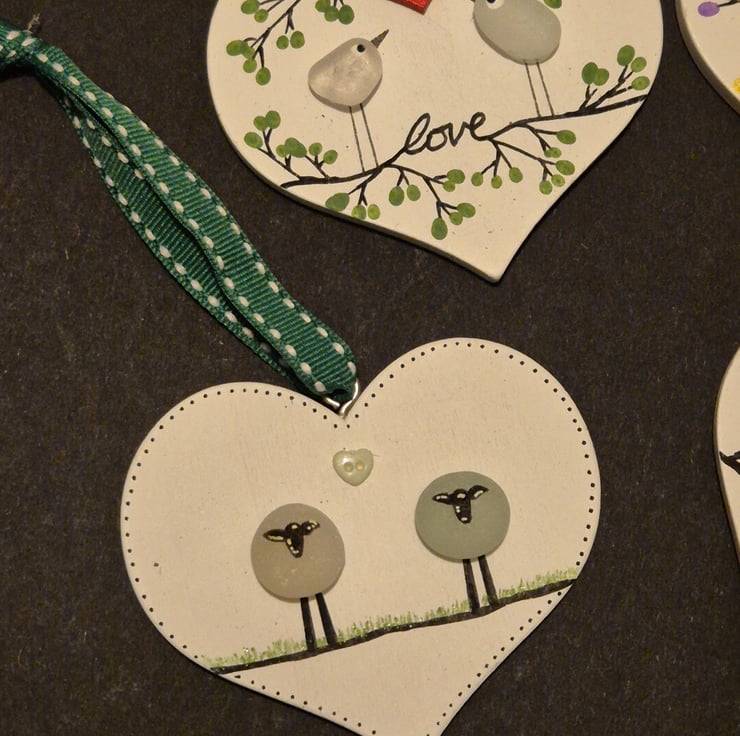 Set of 4 handmade hanging wood hearts with seaham seaglass birds love gift
