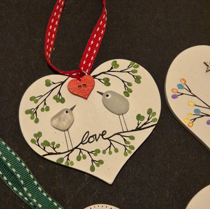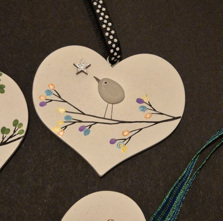 Beautiful set of handmade hanging wooden hearts with seaglass birds