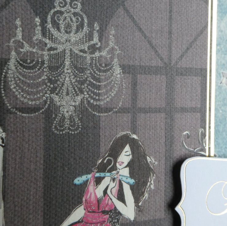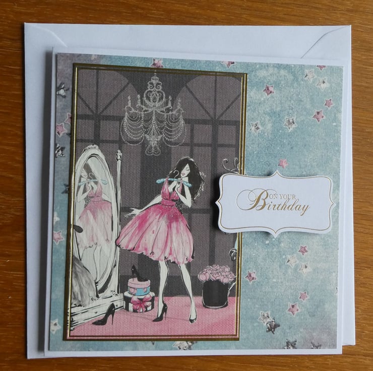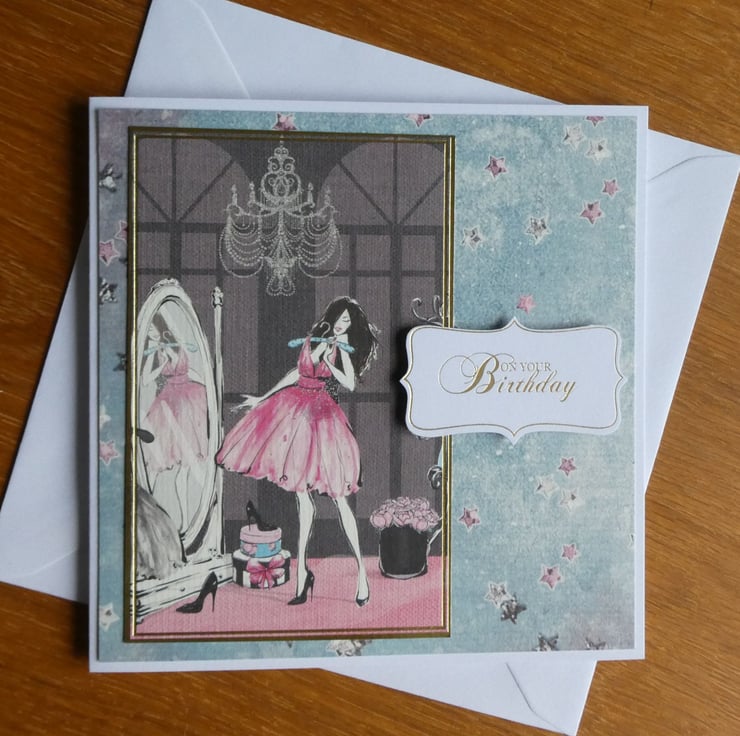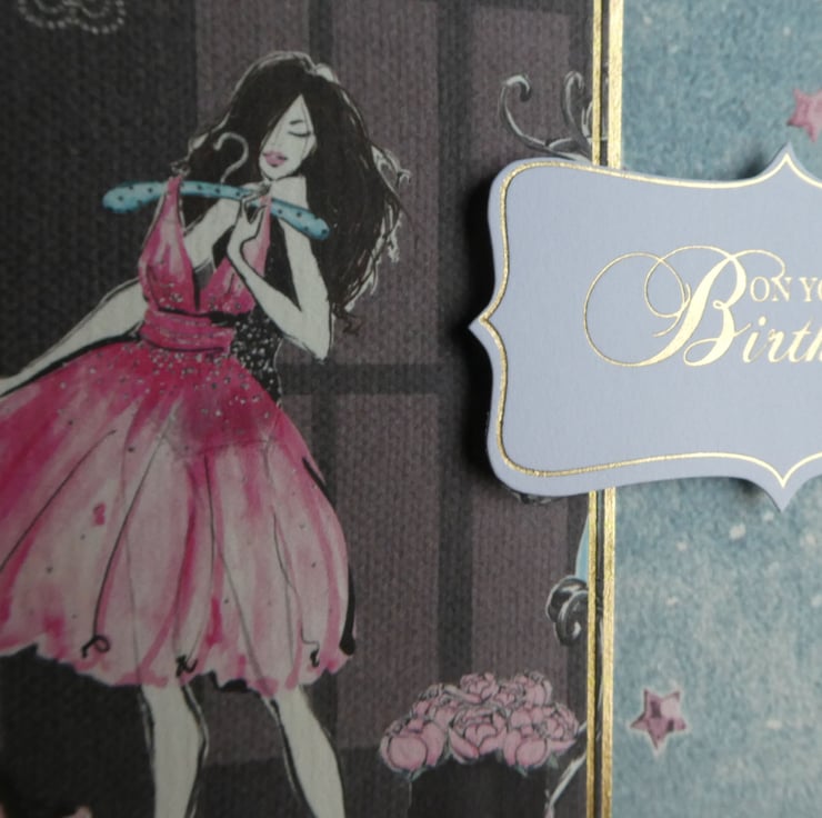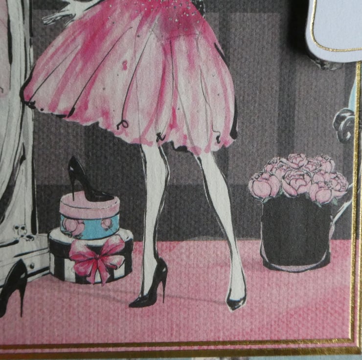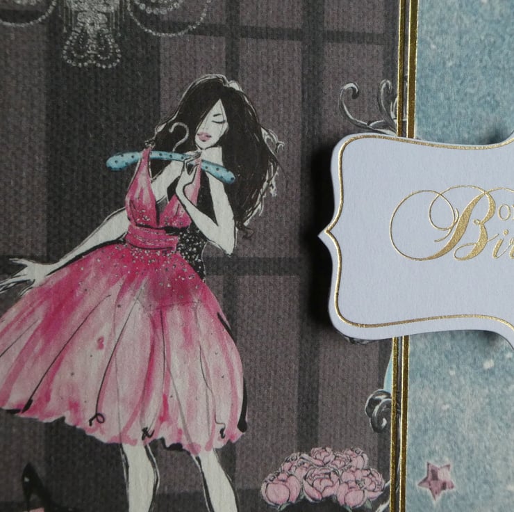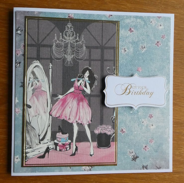 The card has a background of soft blue with an abstract design of stars in white, pink and grey. A card topper has been added on the left hand side with the image of a young lady holding a pink dress in front of a mirror where she is trying on clothes, surrounded by hat boxes, shoes and flowers.