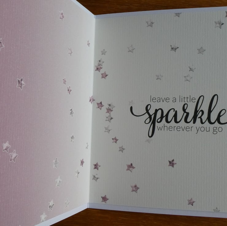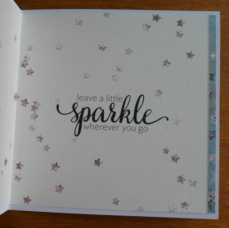 Inside the card there is a cream paper insert, printed with matching stars and borders and the message Leave a little sparkle wherever you go. Space has been left to allow you to write your own message.