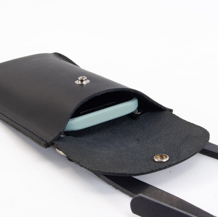 A standard iPhone fits easily, but if you have a flap over case or something chunky it might be too snug. Please ask if you need any more measurements.