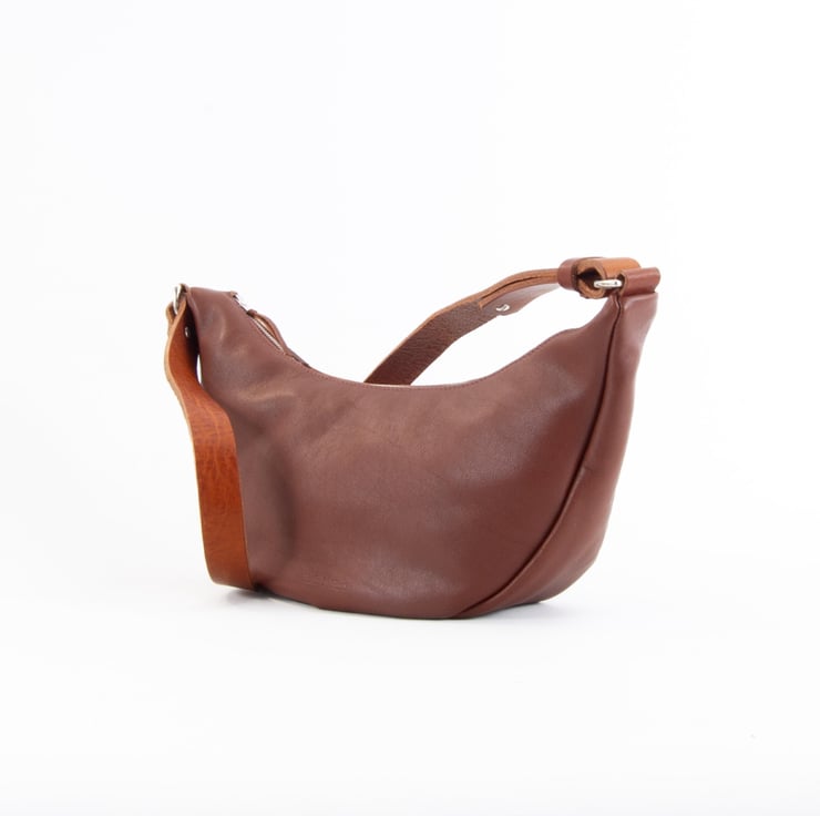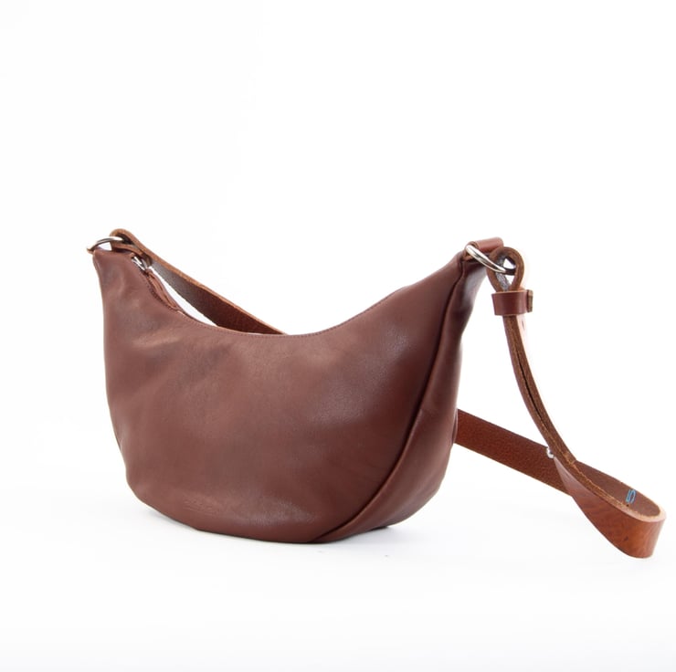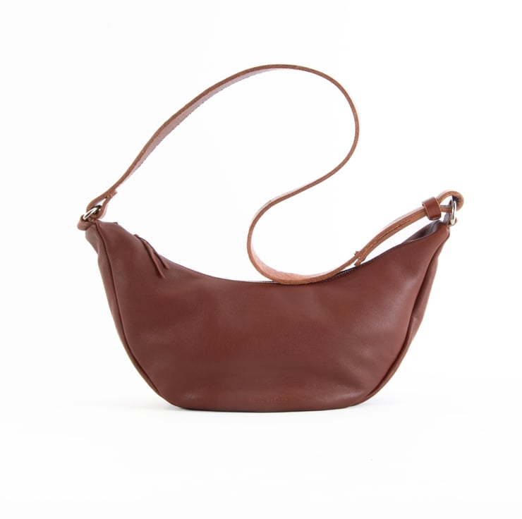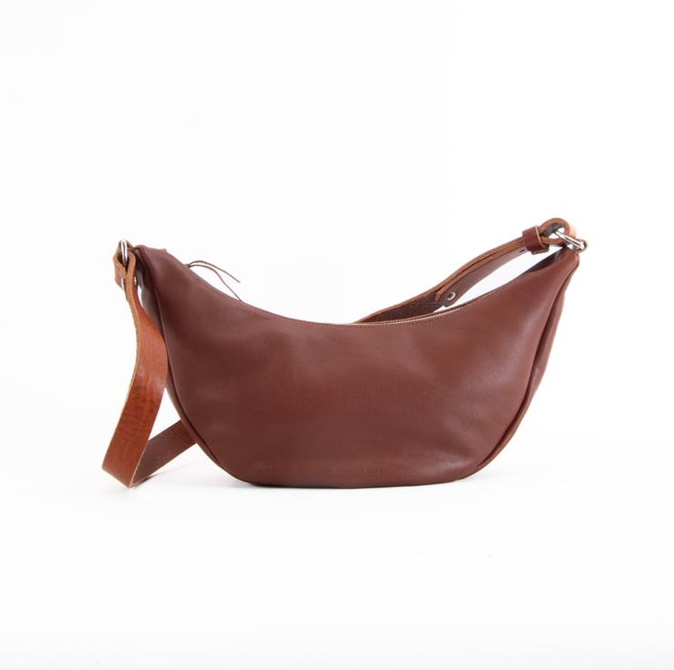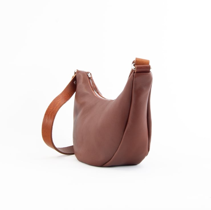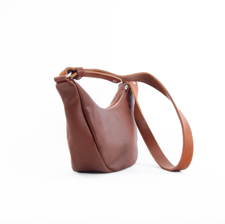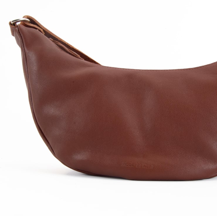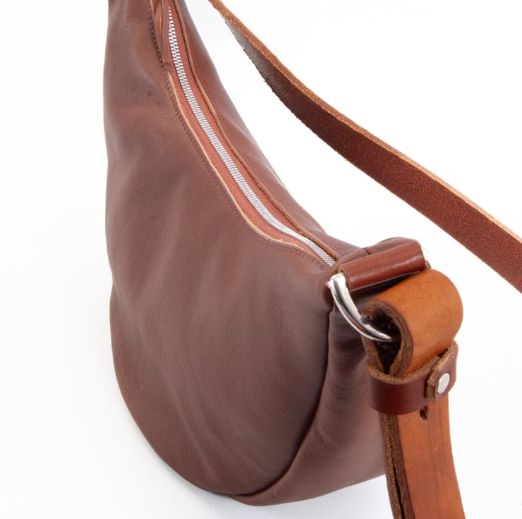 Super soft zipped tan leather sling bag. Handmade in Kent, UK.