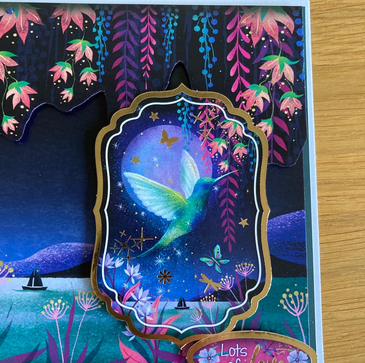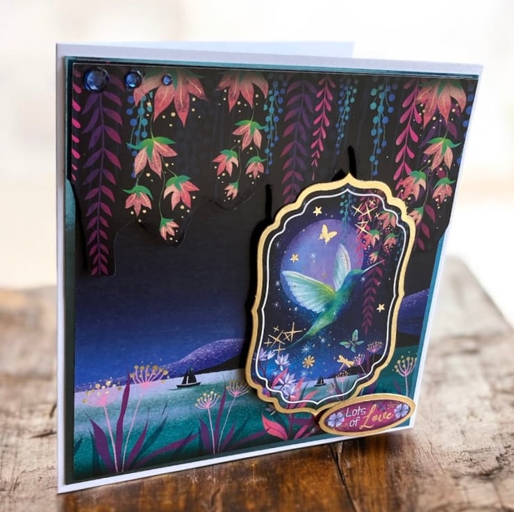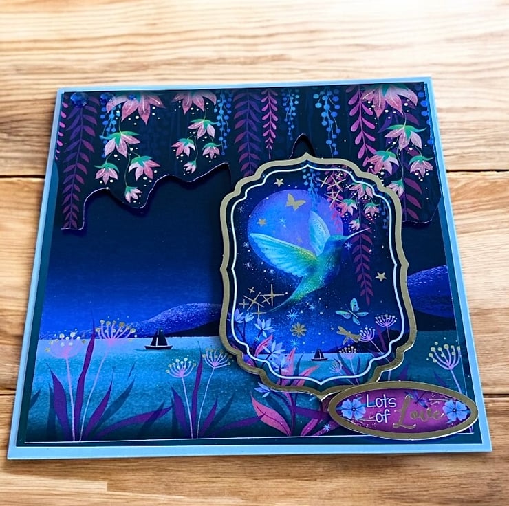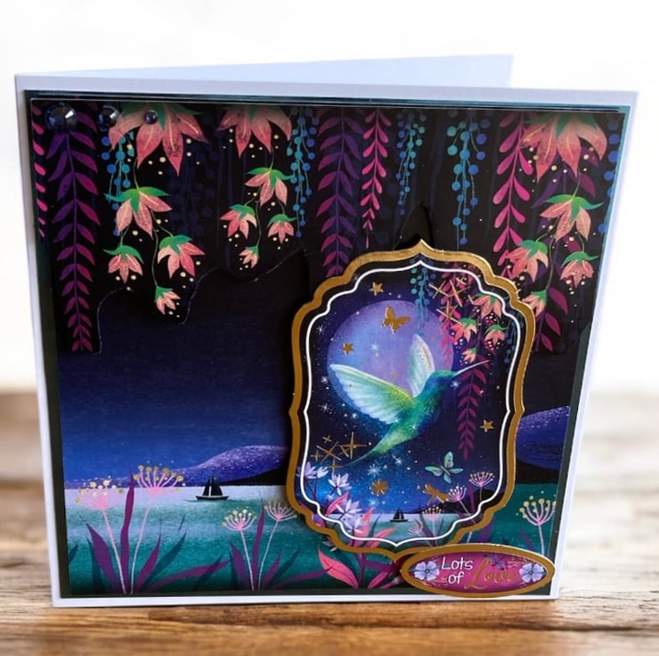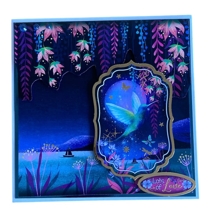 This handmade 6 x 6 inch greeting card features a dreamy hummingbird flying across a moonlit lake, surrounded by trailing flowers added in 3D, soft stars and rich twilight blues. The layered design and gems creates depth and sparkle, with delicate details that catch the light beautifully and give the card a truly magical feel.