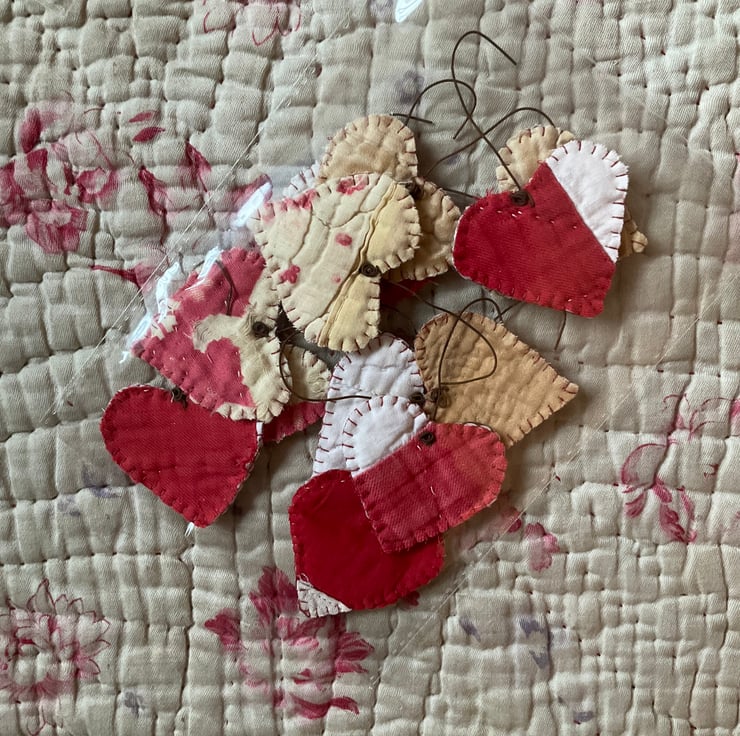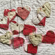 A lovely collection of handmade hearts, all made from either antique quilt or patchwork. Each heart is edged in blanket stitch and hangs from a piece of rusty wire. - pack of 12 hearts.
