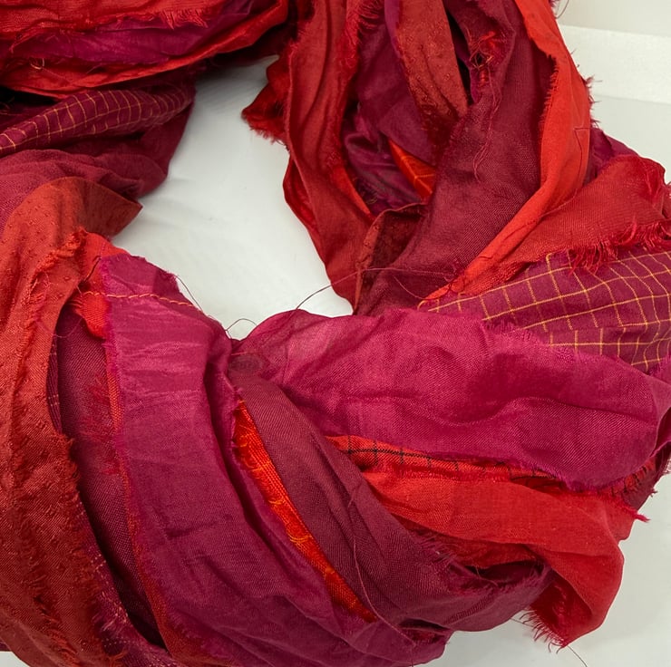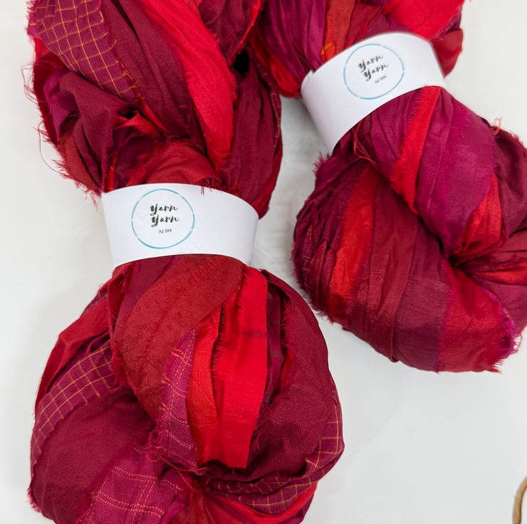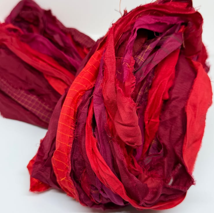 This is a beautiful quality of sari silk ribbon, which has been hand dyed in stunning red shades. Sari silk waste fabric sewn end to end to form a planet friendly recycled silk ribbon yarn. Suitable for knitting, crochet, weaving, jewellery making and arts and crafts.