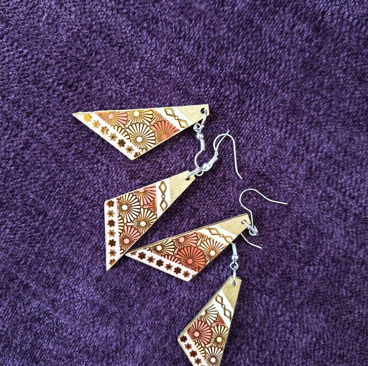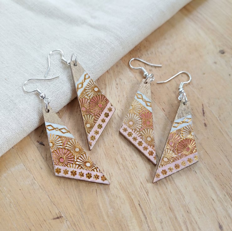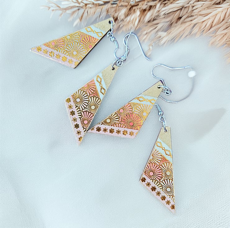 Elegant, eye-catching, and full of handmade charm — these geometric teardrop earrings blend floral Washi tape with a golden chrome finish for a look that’s both boho and refined. Each pair is decoupaged and varnished by hand, making them lightweight, tactile, and easy to wear all day. Whether you’re dressing up for a summer picnic, gifting a friend, or adding a splash of colour to your everyday, these earrings bring a touch of joy and artistry to any outfit.