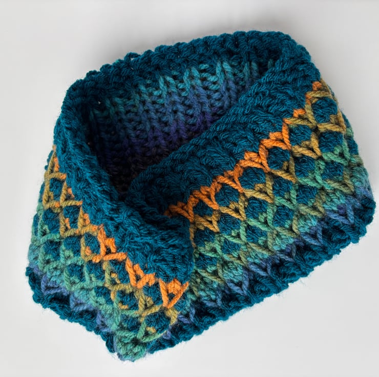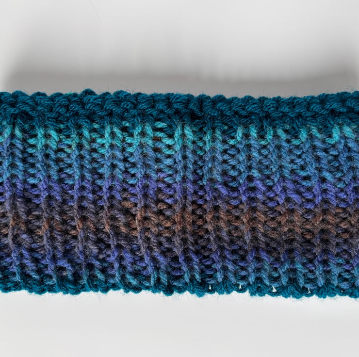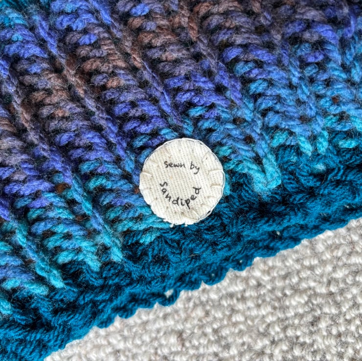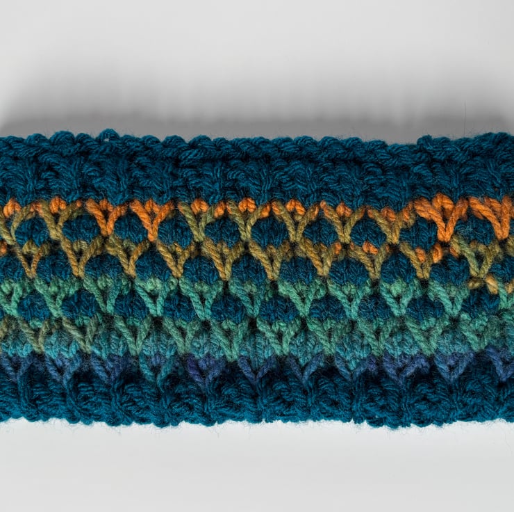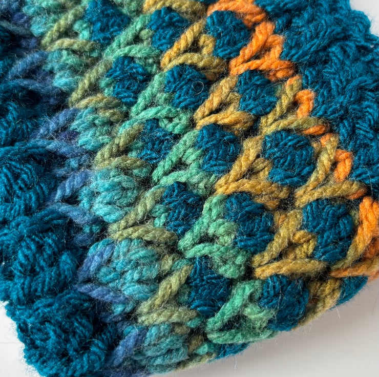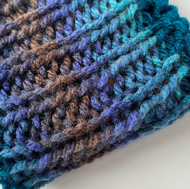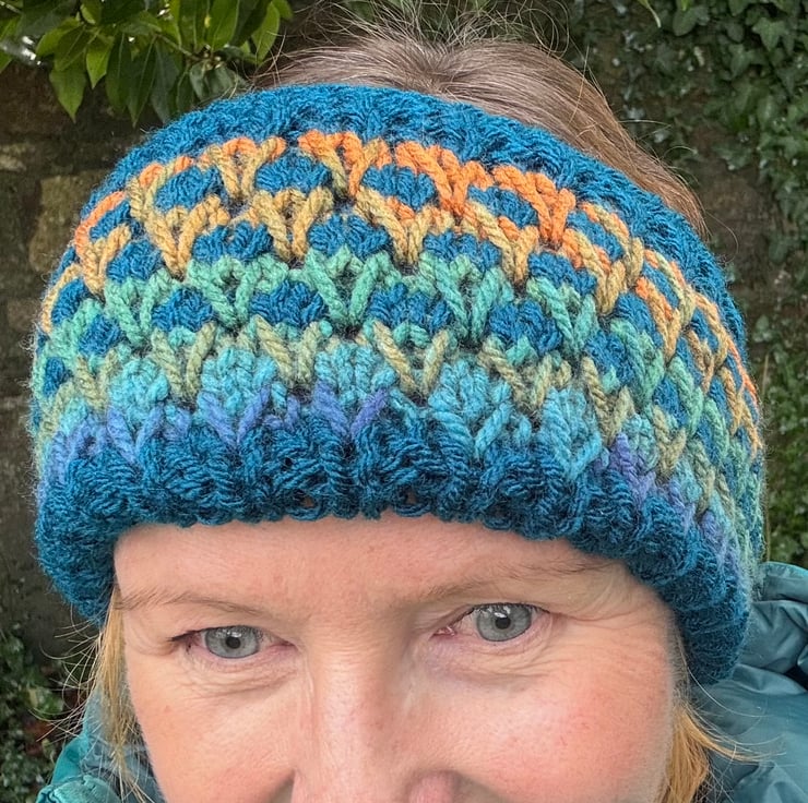 The headband is double thickness and reversible. One side is a lovely textured ‘V’ stitch, the other side is a stylish rib.