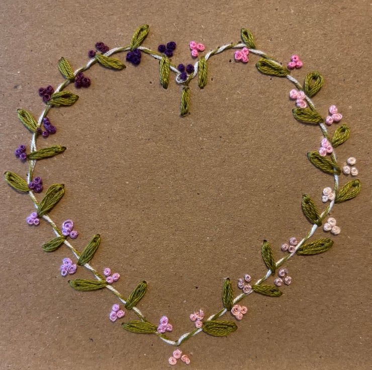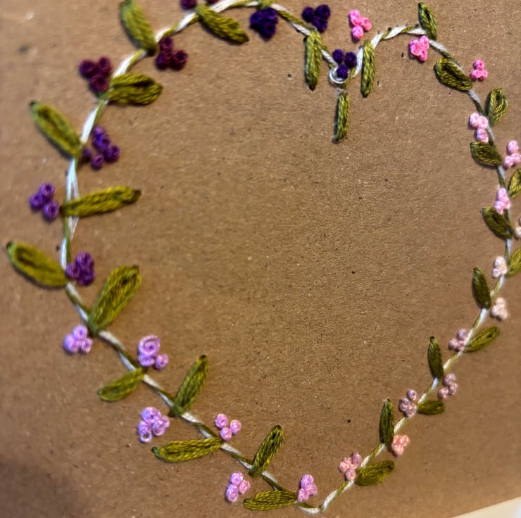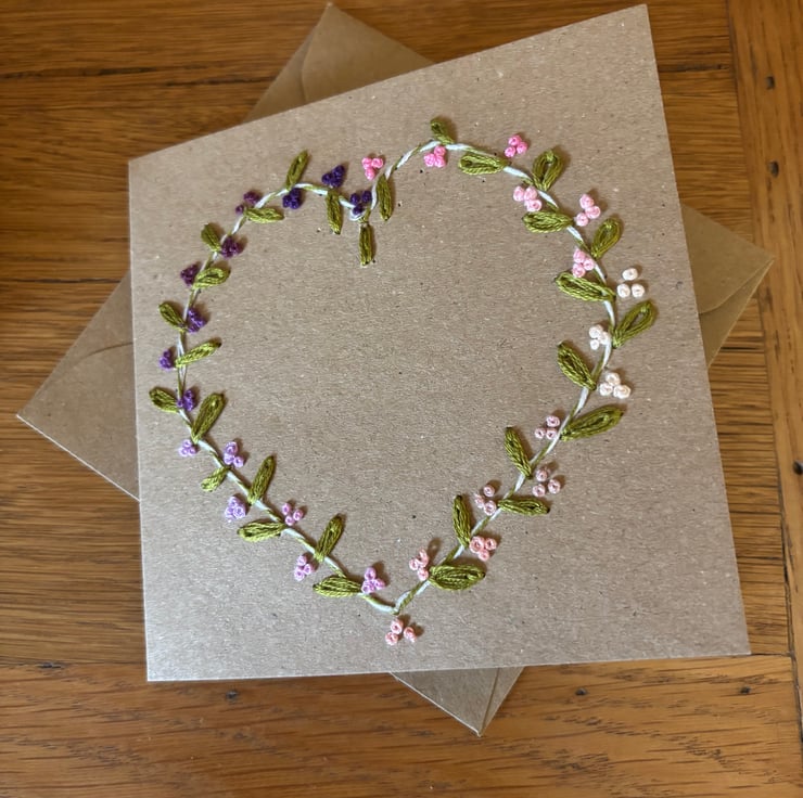 Hand embroidered leaves and buds surrounding a thread entwined heart make this a beautiful card for Valentine’s or just for that special person’s birthday. A keepsake card, looks amazing in a frame, as in photo (frame not included).