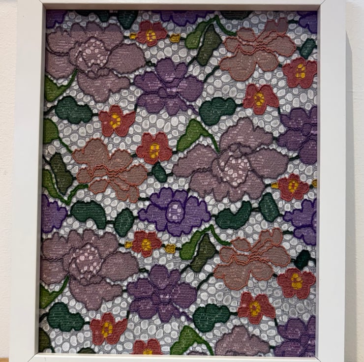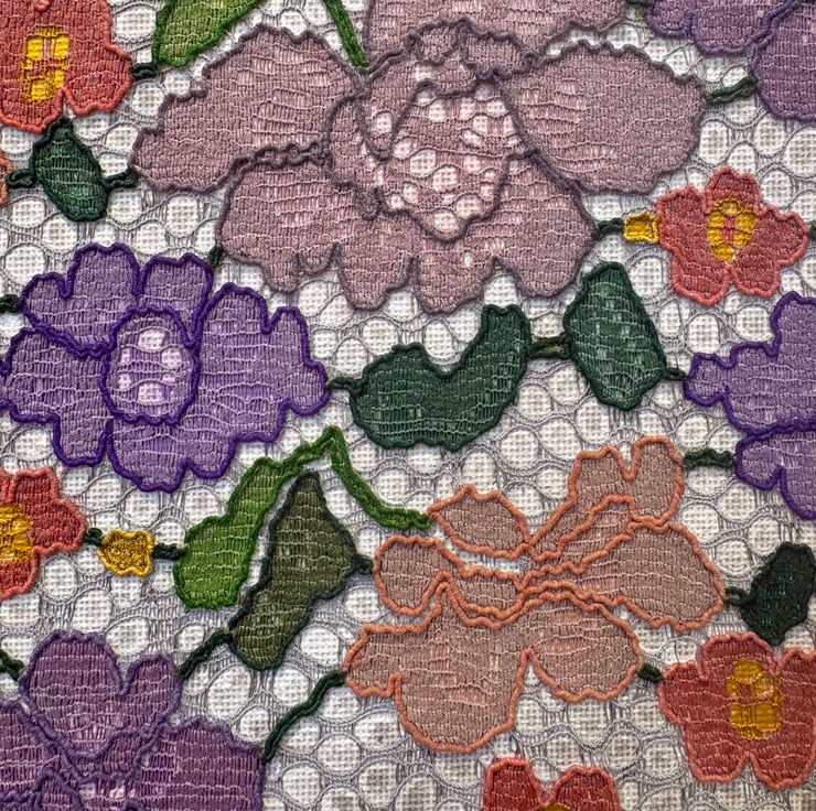 To me, lace brings nostalgia and elegance. This piece is an experiment of how to use the patterns in the fabric to shape the final picture. I love that by adding colour the patterns in the lace stand out, producing a striking result.