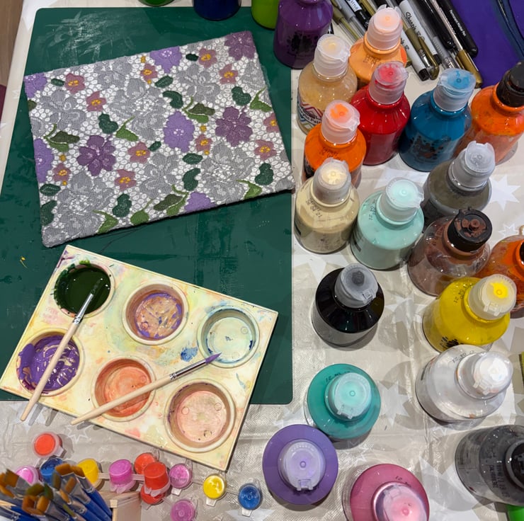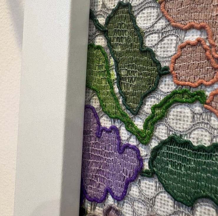 A delightful piece that evokes a sense of nostalgia. Using lace as the subject, it is painted with soft purples, dusky pinks and greens to bring the lace patterns to life.