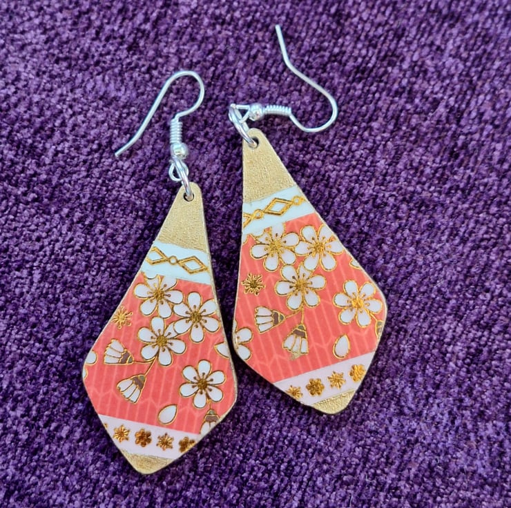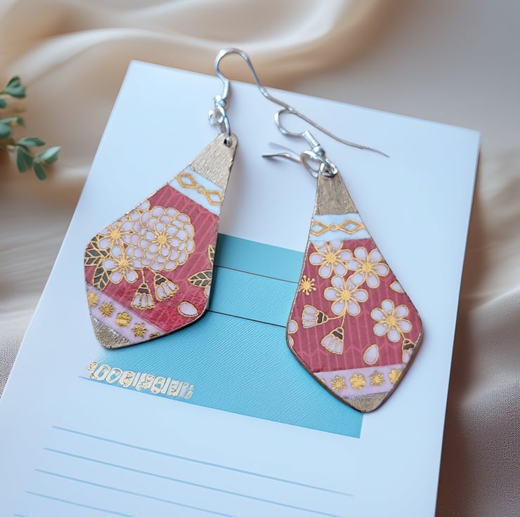 Stylish Cherry Blossom Boho Teardrop Earrings – Golden & Pink Washi Tape Dangles