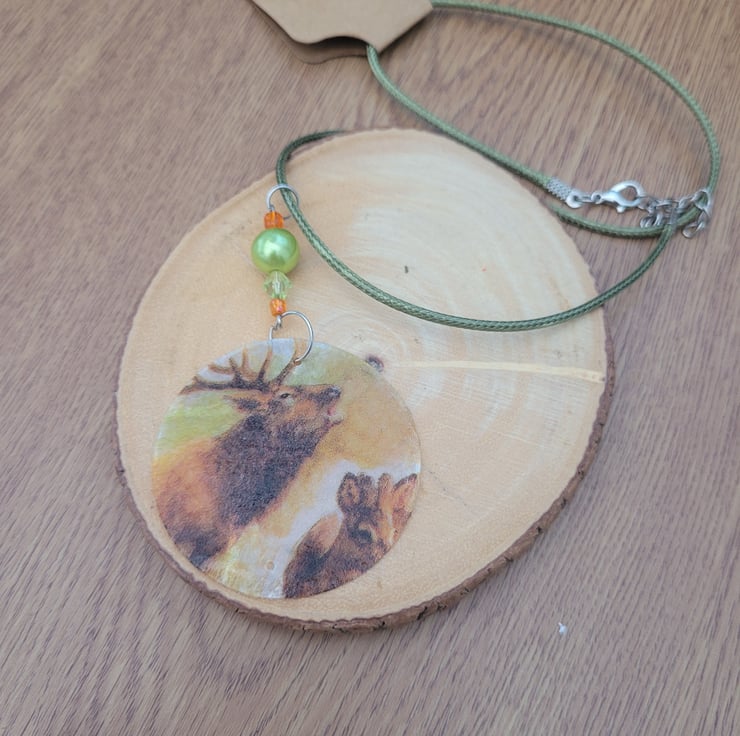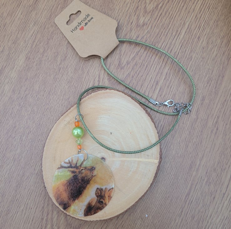 Upcycled Decoupage Deer Necklace with Green Wax Cord