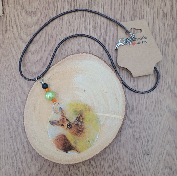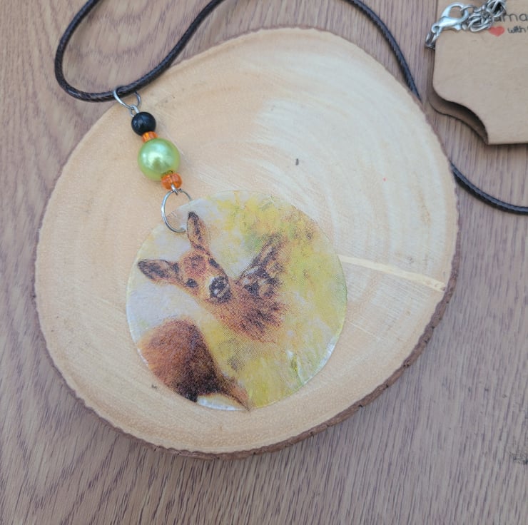 Upcycled Decoupage Deer Necklace with Black Wax Cord