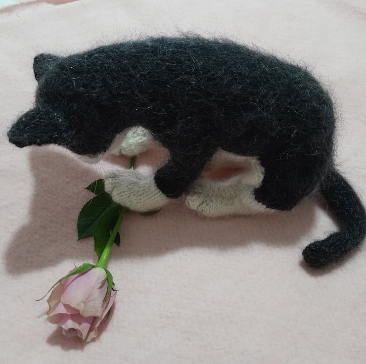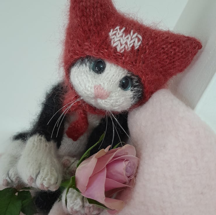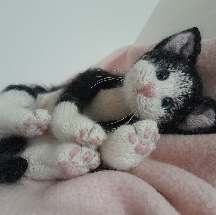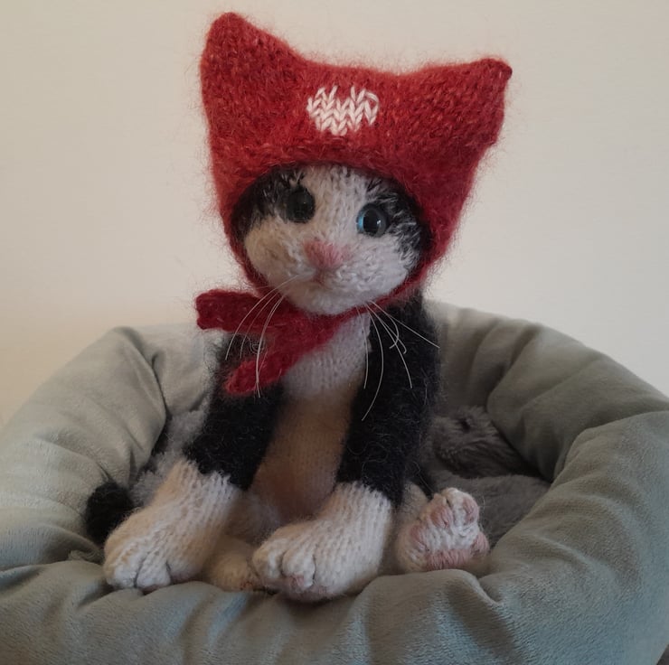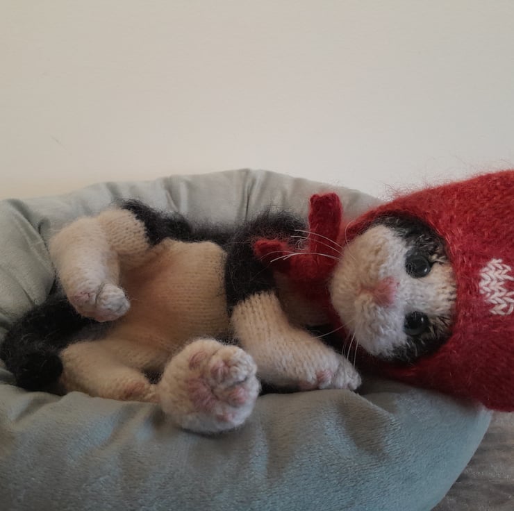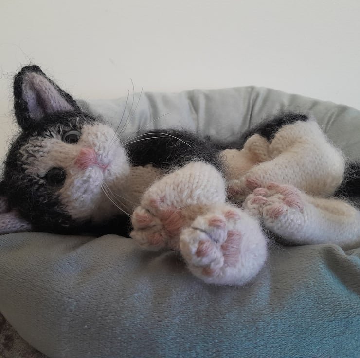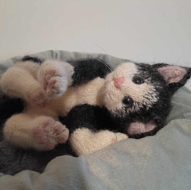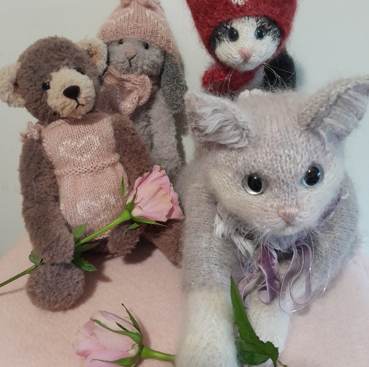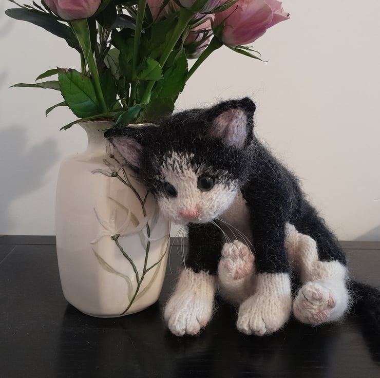 The kitten is knitted in an alpaca yarn together with kid silk mohair yarn and additional hand brushing to add a soft finish.