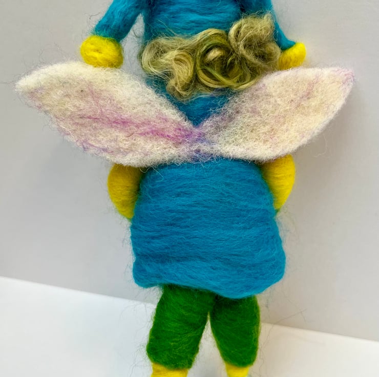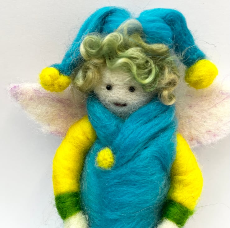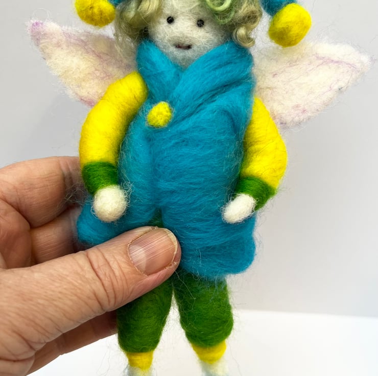 Pip is a cheeky felted pixie who measures 18cm heigh. He is a snappy dresser with his flashy blue coat and double Pom Pom hat with matching shoes. He has green and yellow trousers and jumper. The magical little pixie will make a wonderful unique gift for any occasion .