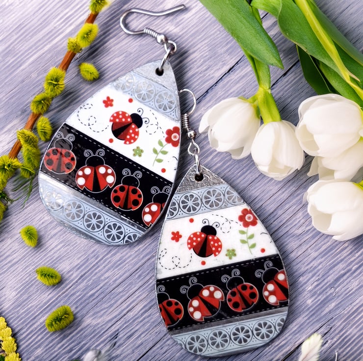 Bright, bold, and bursting with charm — these ladybird-themed teardrop earrings are handmade with vibrant Washi tape and a silver chrome finish. Each side features a different design: one with ladybirds on rich red, the other on black, both with subtle floral details. Wear them red-side out, black-side out, or mismatched for extra fun. Lightweight and easy to wear, they’re perfect for spring, Easter, garden parties, or just adding a splash of joy to your day.