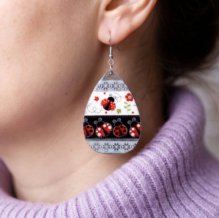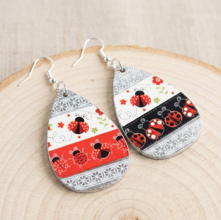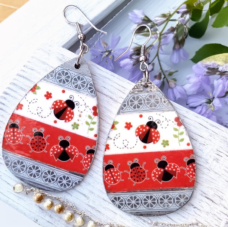 Ladybird Teardrop Earrings – Handmade Washi Dangles with Silvery Finish
