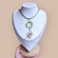 Made with shell, napkins, broken jewellery, and stainless steel/zinc alloy jump rings/pins. Wax cord chain: 5cm extension chain, 45 cm in length. Metal - 14ct 3 colour gold.