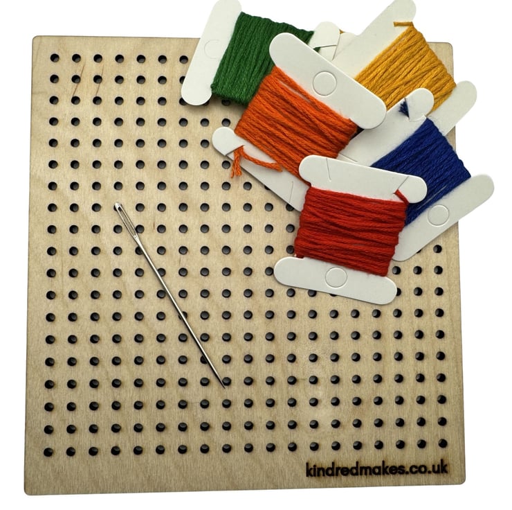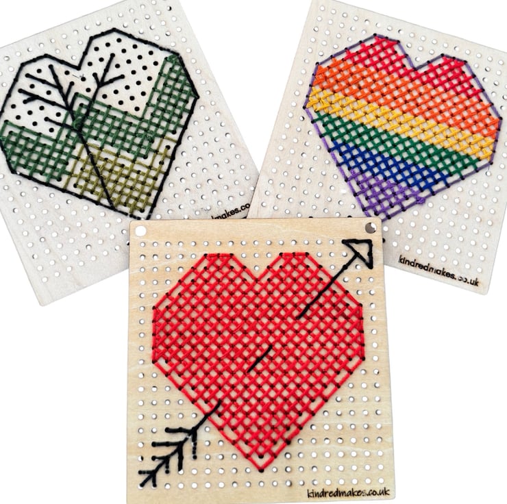 A simple kit to enable you to create a rainbow coloured heart on a 3mm wood ply board, using a simple cross stitch and backstitch. The kit is suitable for beginners, and a QR code is provided to access a handy guide to help you make. Once completed you can choose to use the 3D printed mini stand or the provided twine to display your creation.