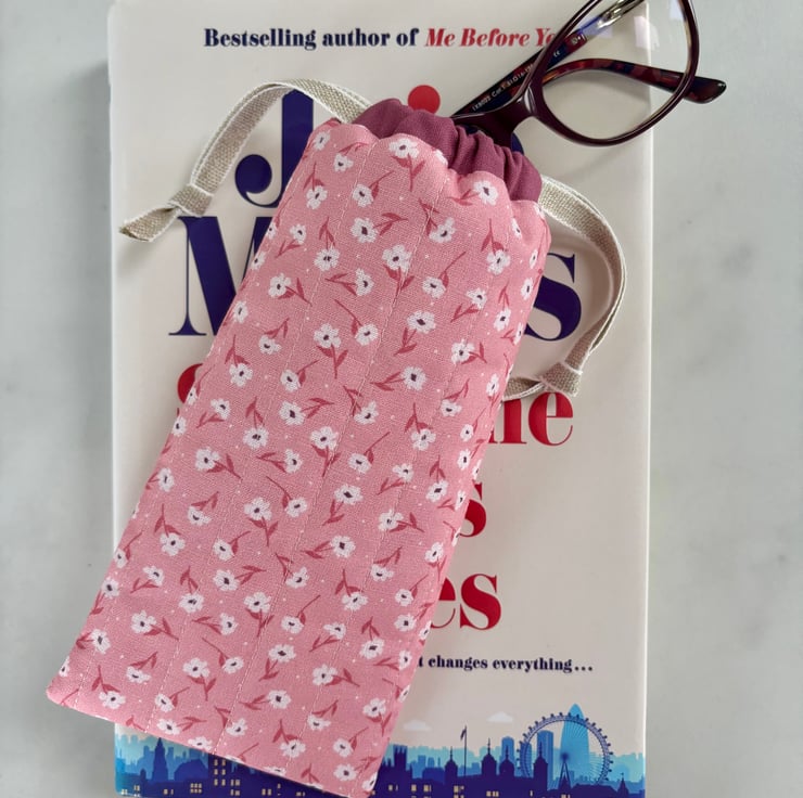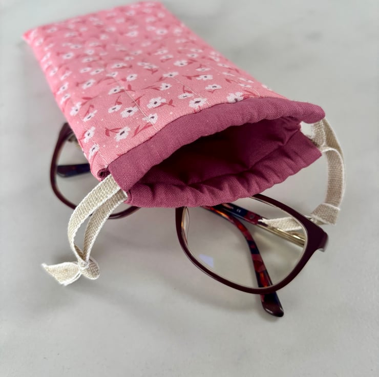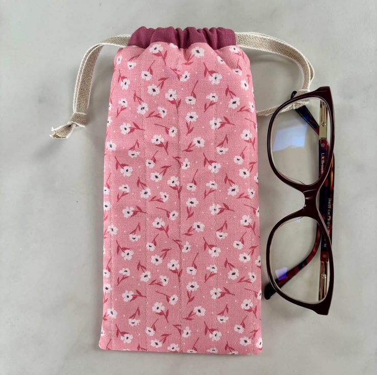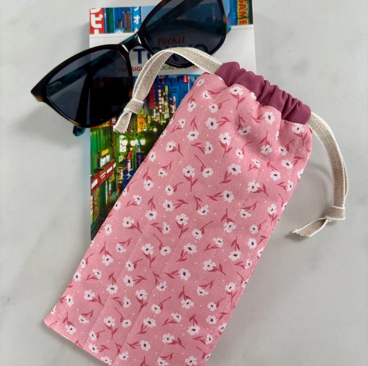 Handmade drawstring pouch for glasses or sunglasses. Beautiful soft cotton in a floral print in shades of pink and white, that is lightly padded to help keep your glasses safe from light bumps and scratches.