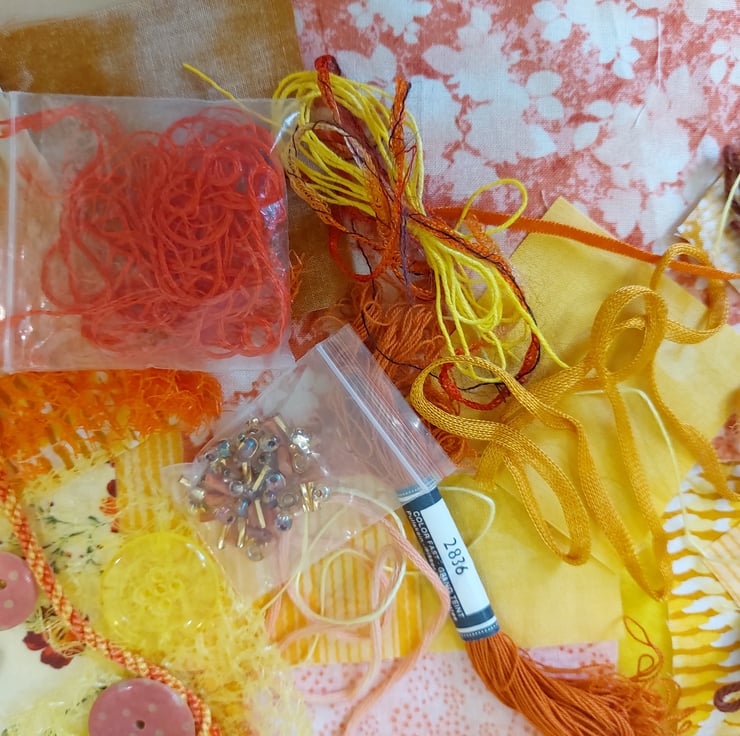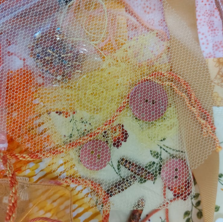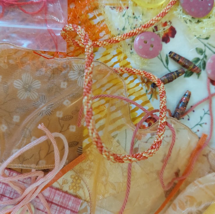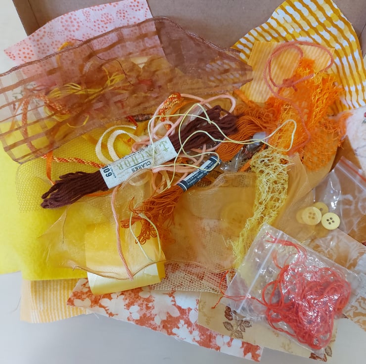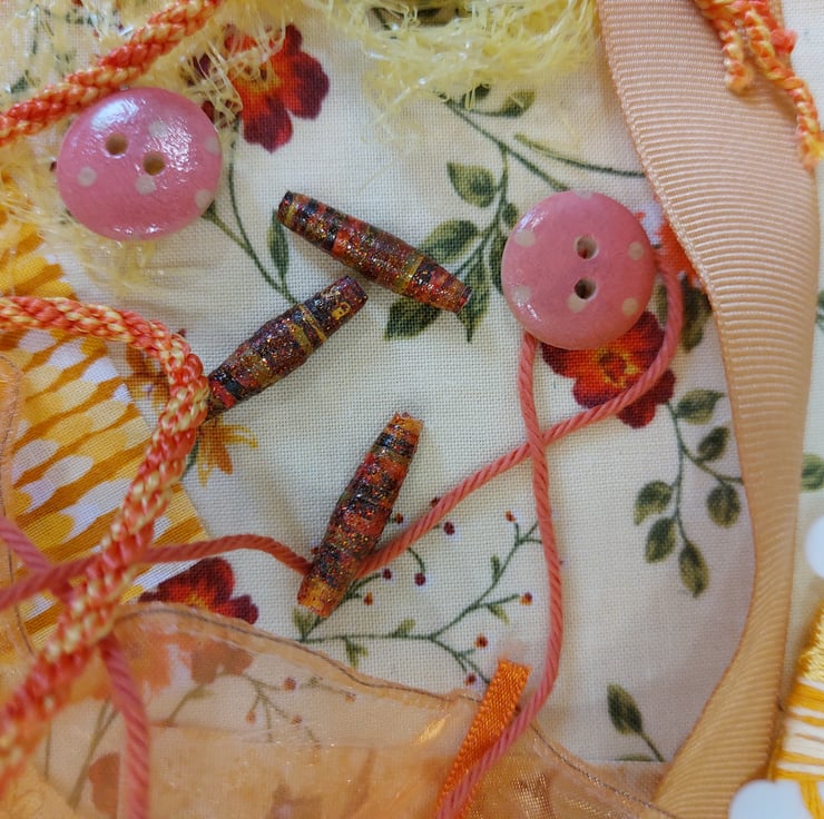 Lovely range of fabric scraps, ribbons, threads, handmade paper beads, buttons, seed beads, net and more. Ideal for textile collage or junk journals. All packs are very similar and will be picked at random.