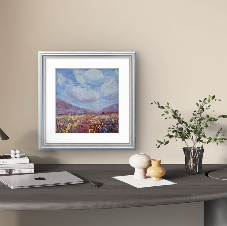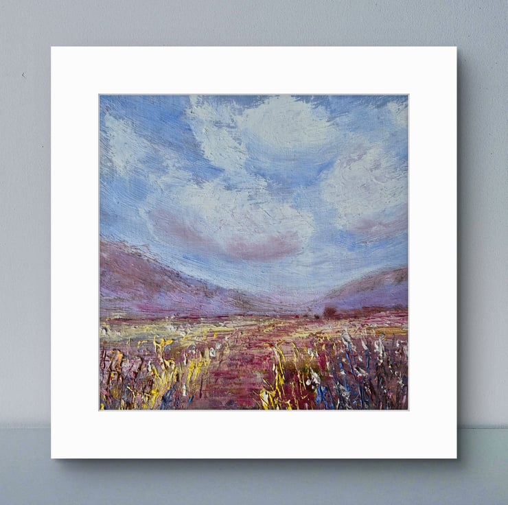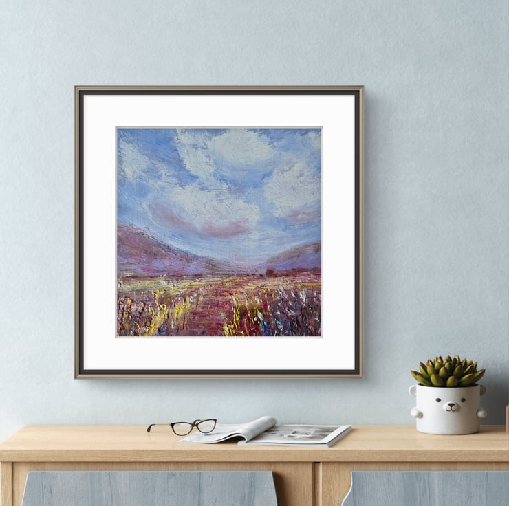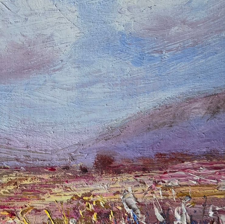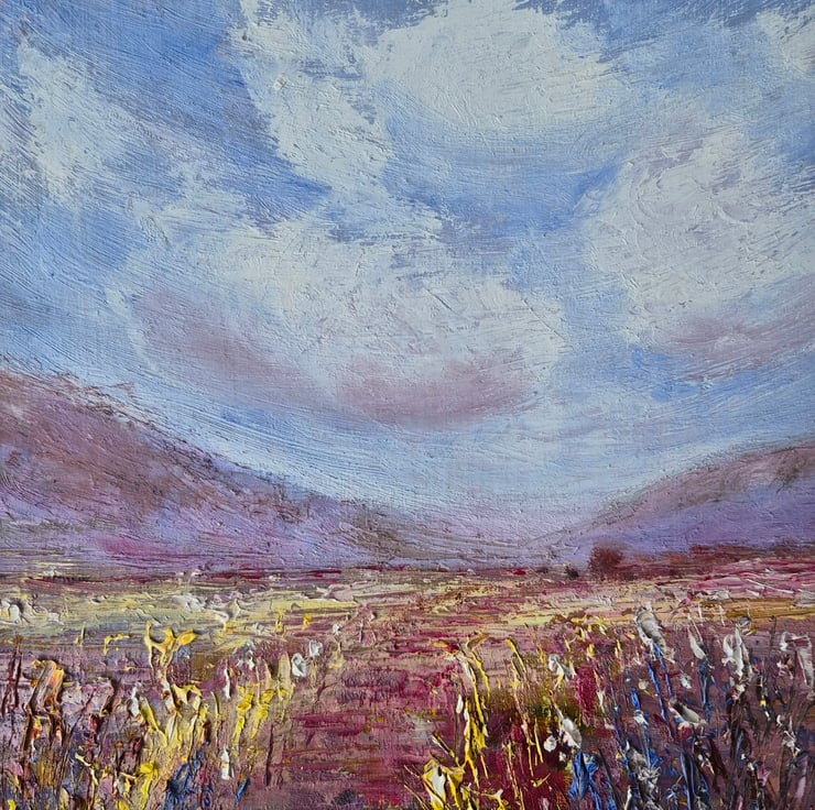 "Track to distant hills" is an original oil painting featuring a wistful landscape with hills in background. There is alot of texture in the artwork.