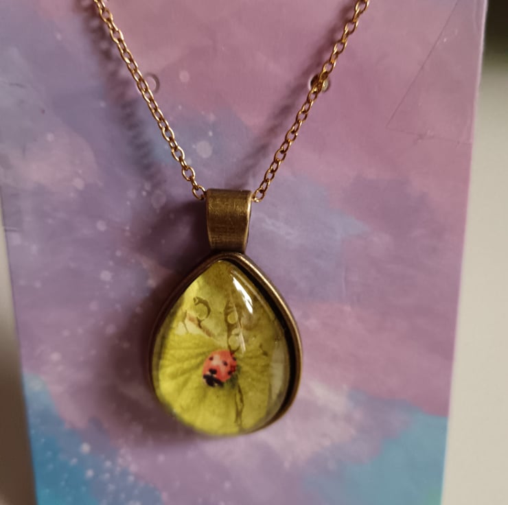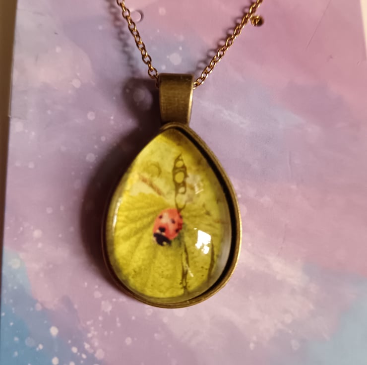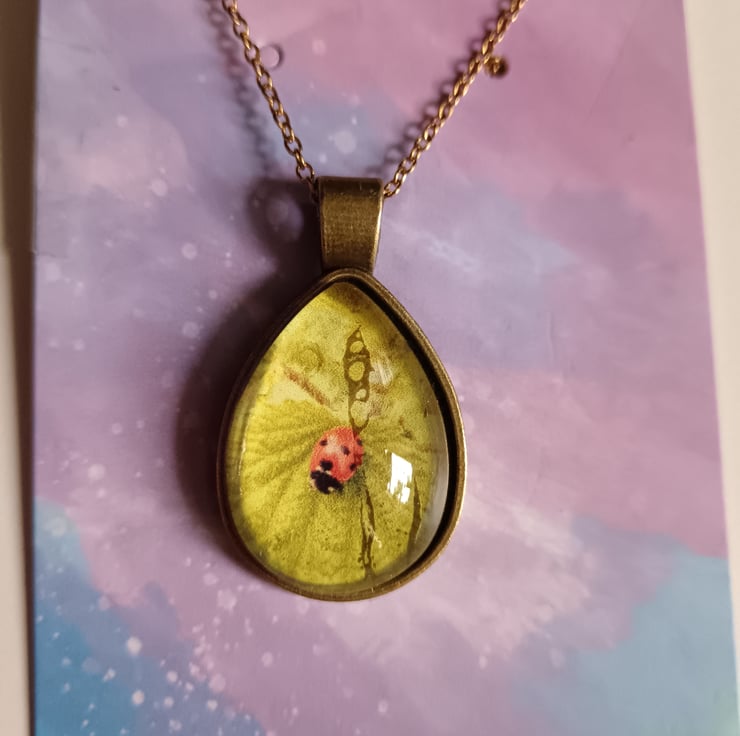 Beautiful necklace featuring photography of ladybird in a teardrop style pendant.