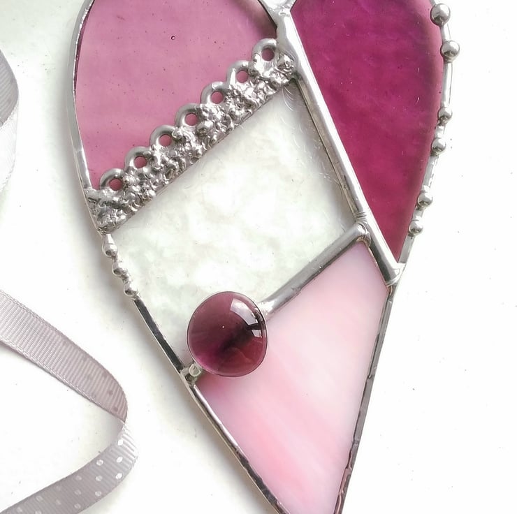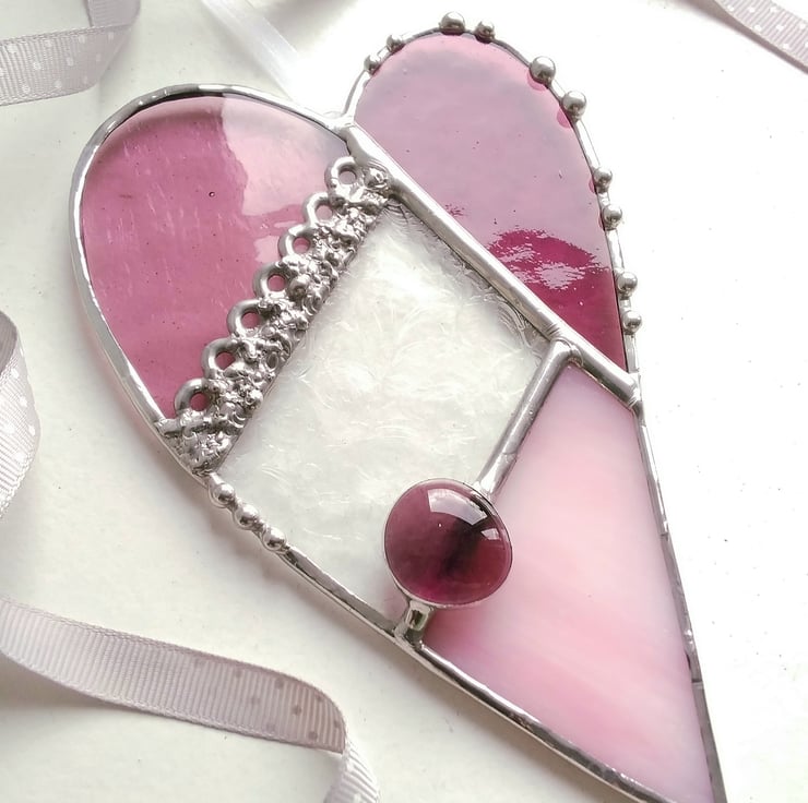 Stained glass heart handcrafted from a selection of four differing glass types in pretty rose-pink and lacy glue chip and finished with decorative hammered polished solderwork and a glass nugget. Ready to hang on an organza ribbon.