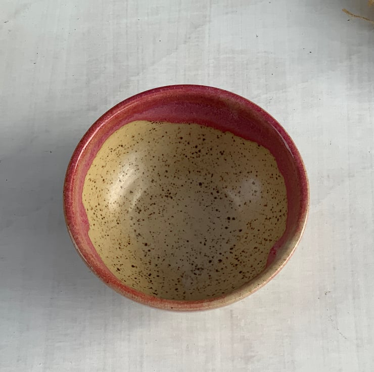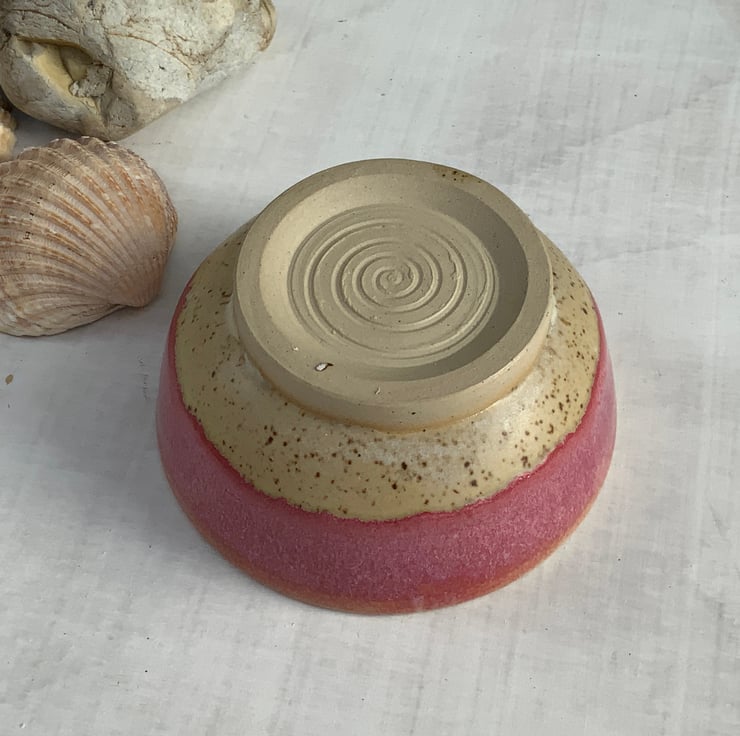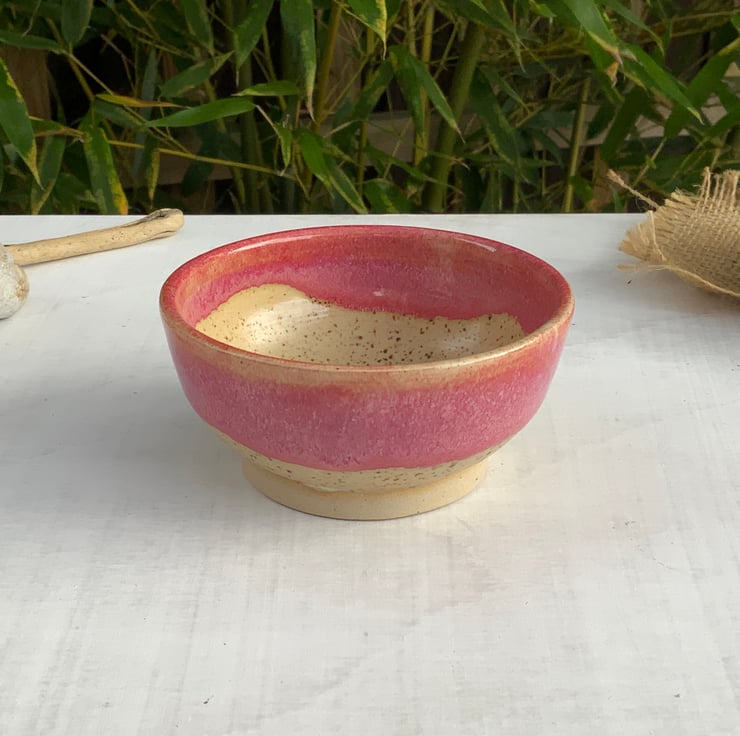 This beautiful little bowl is perfect for rings, trinkets or as a display piece. It has been wheel-thrown using stoneware clay and hand glazed with a combination of Winter Wood and Raspberry Mist glazes. The flow of the glazes and the hand turned foot make this an elegant item to enhance your home.