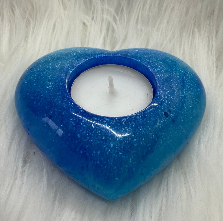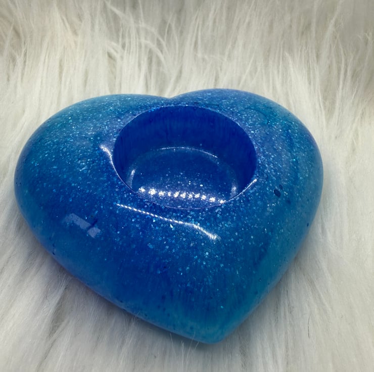 This resin tealight holder has glitter a vivid shades of blue throughout and is an adorable heart shape.