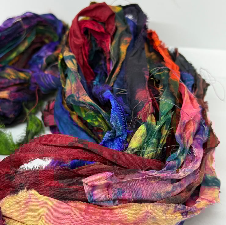 This is a beautiful quality of sari silk ribbon, which has been hand tie dyed in homes in India. The colours are mixed, and blended in that layer upon layer of tie dying. Sari silk waste fabric sewn end to end to form a planet friendly recycled silk ribbon yarn. Suitable for knitting, crochet, weaving, jewellery making and arts and crafts.