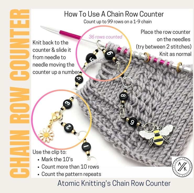 The counter hangs neatly from your needles, so your row count is always visible while you work.