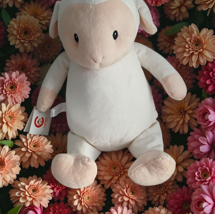 This is Loverbee lamb. Made with the usual soft, plush fabric in and off white. Has a contrast beige face, hands and feet.