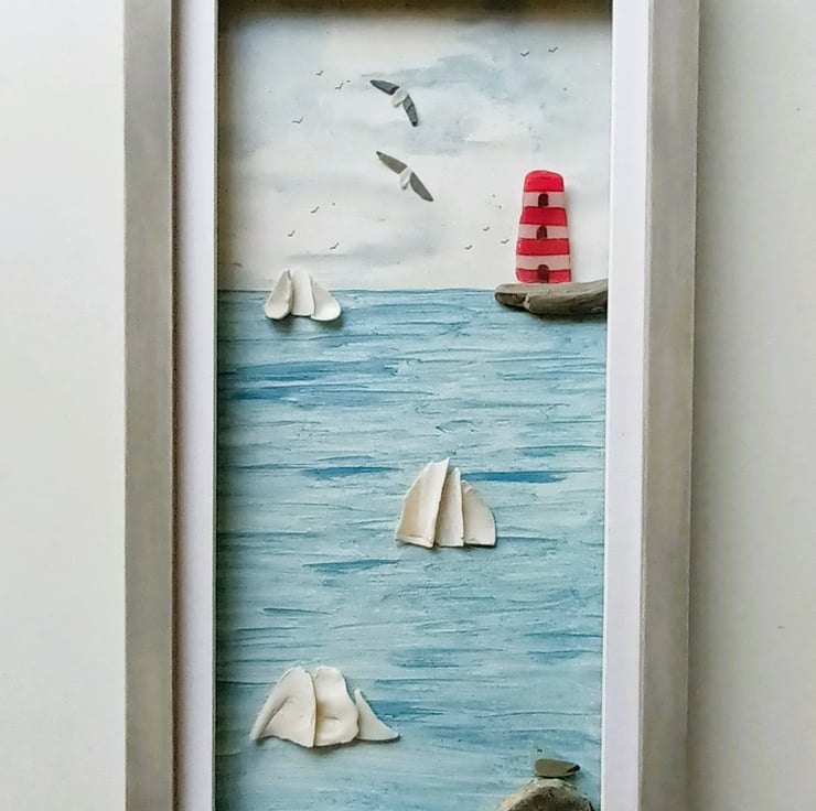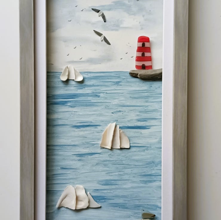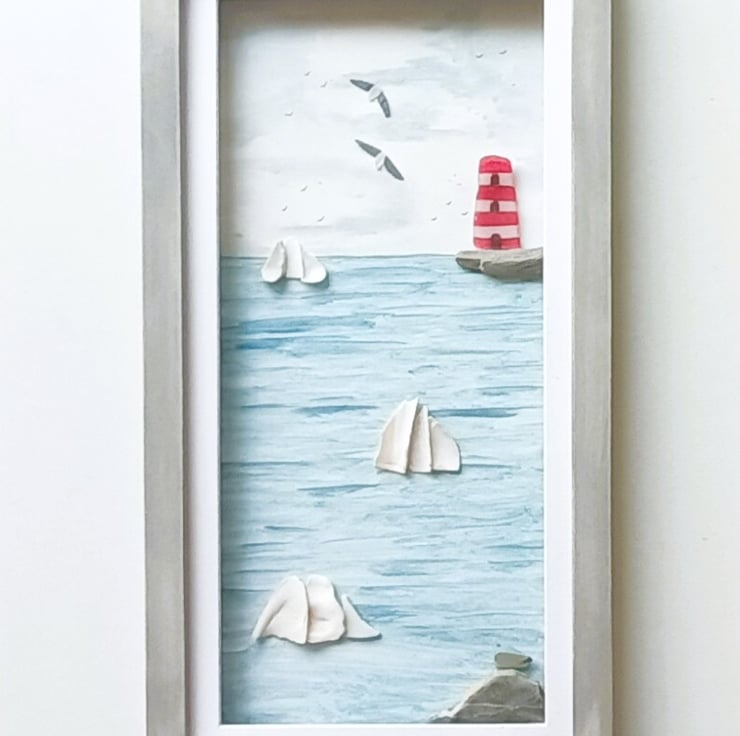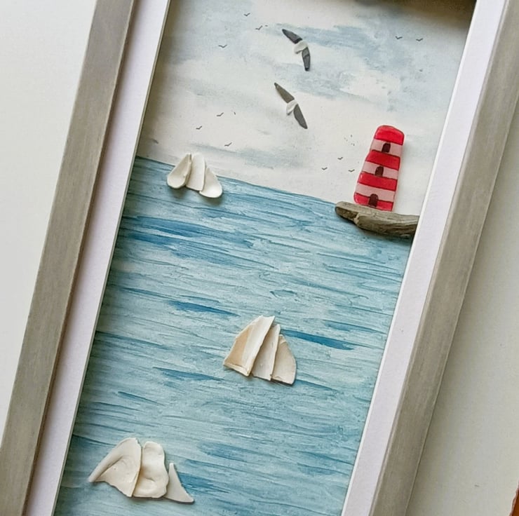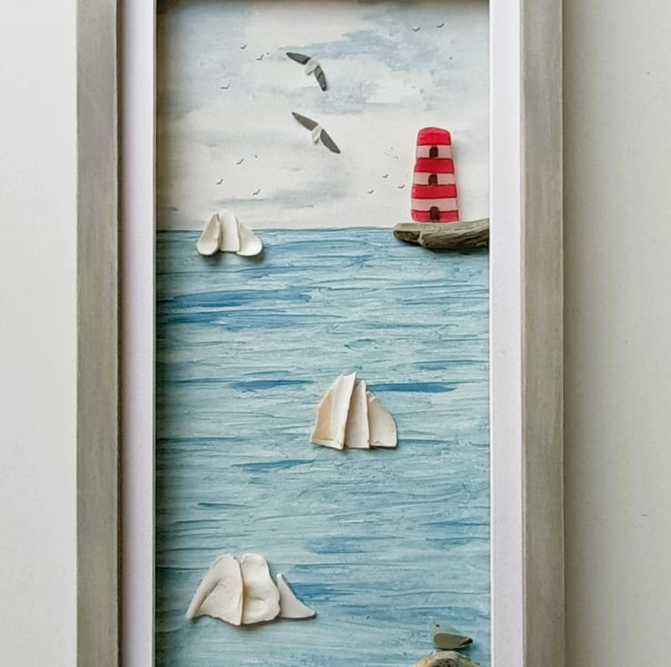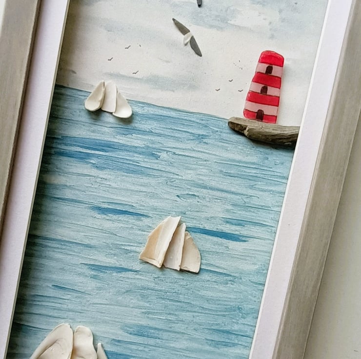 This Cornish coastal scene is set inside a long frame and features sea shell tall ships and a sea glass lighthouse.