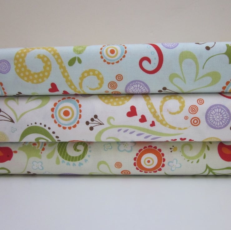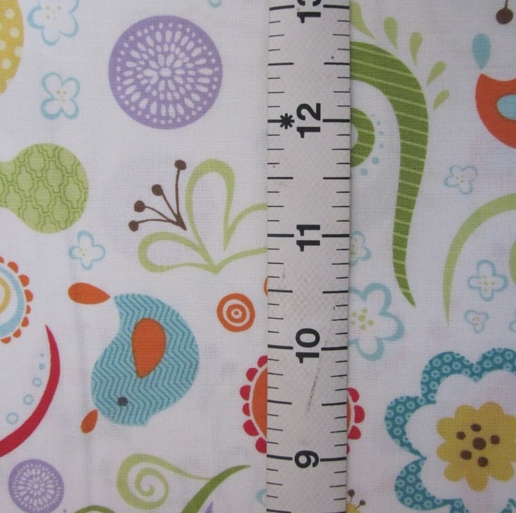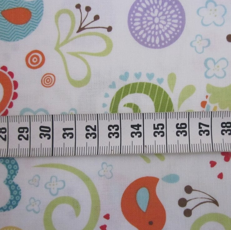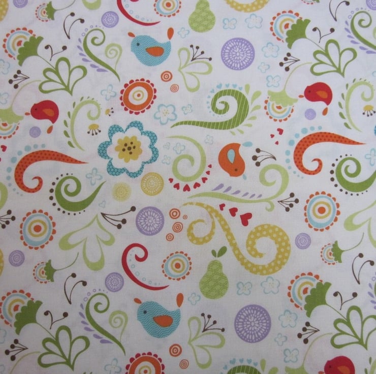 Cotton fat quarter with a pale ivory background patterned with a pattern of multicoloured baby birds, leaves, flowers and swirls