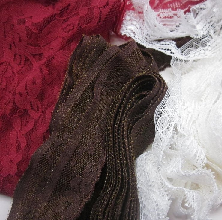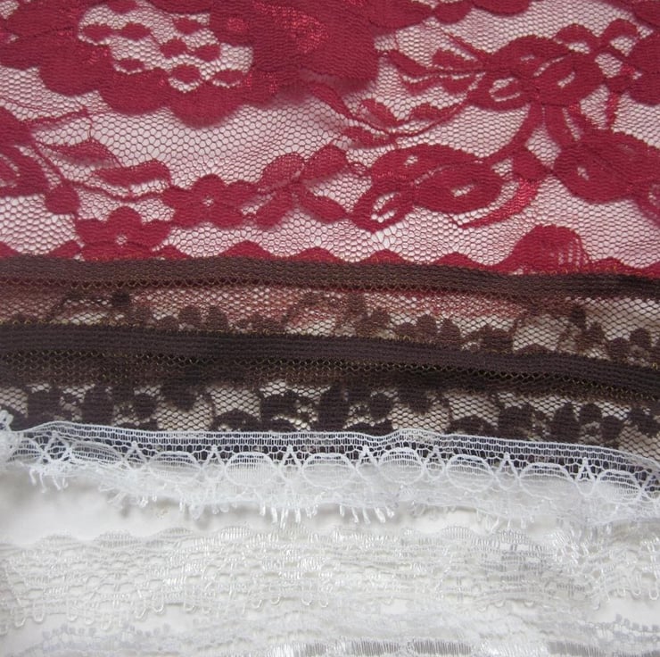 Mixed lace pieces in a variety of shades of red, white and brown.