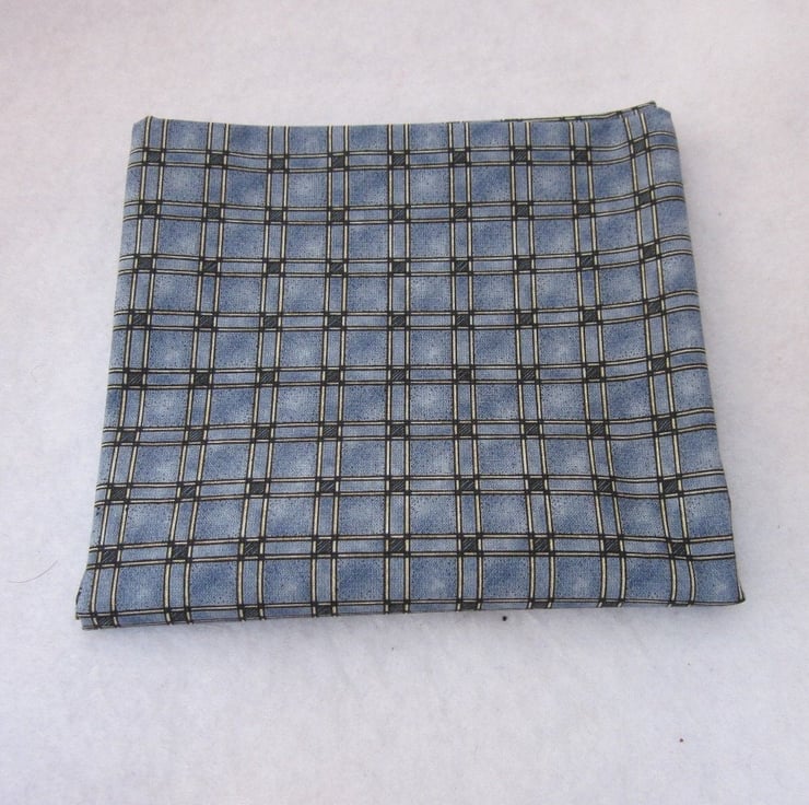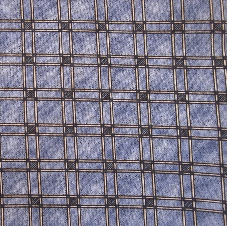 Beautiful cotton fat quarter in smoky denim blue, patterned with a criss-crossed pattern in black