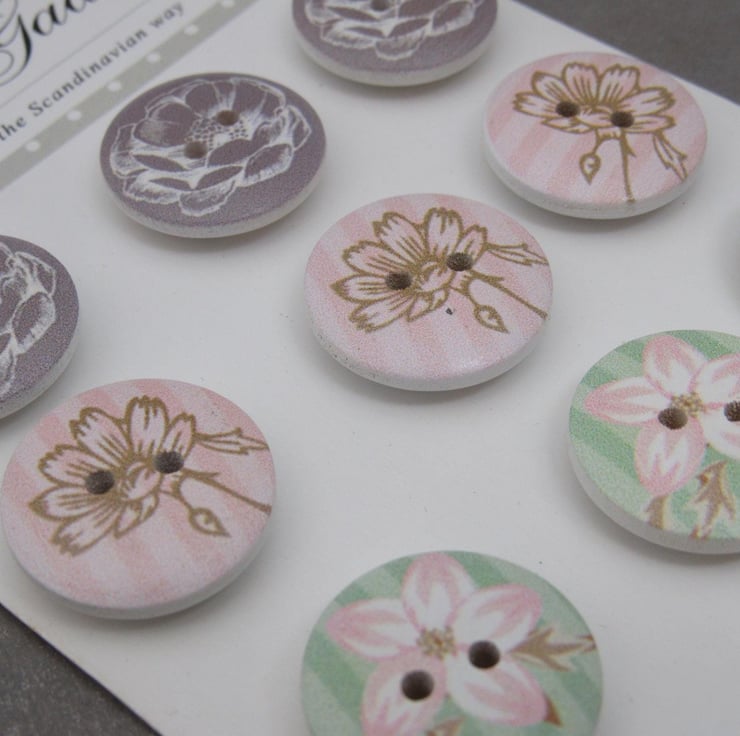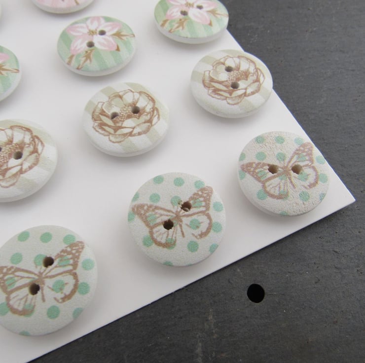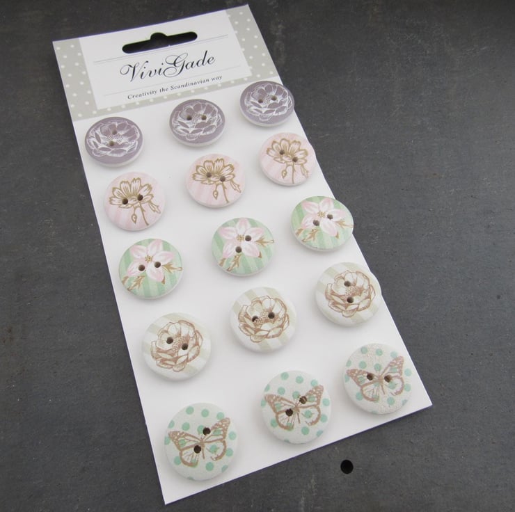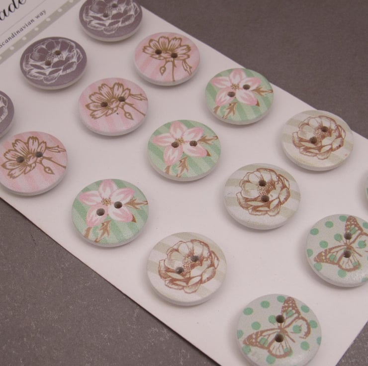 Flowers and Butterflies Wooden Craft Buttons - Vivi Gade Design Pack - 20mm