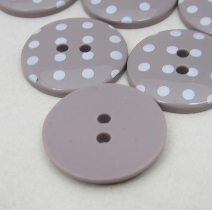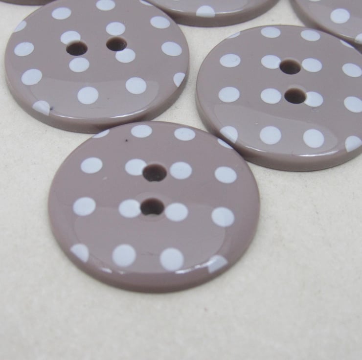 Glossy mushroom brown buttons spotted with white. Reverse is plain brown.