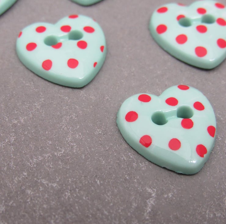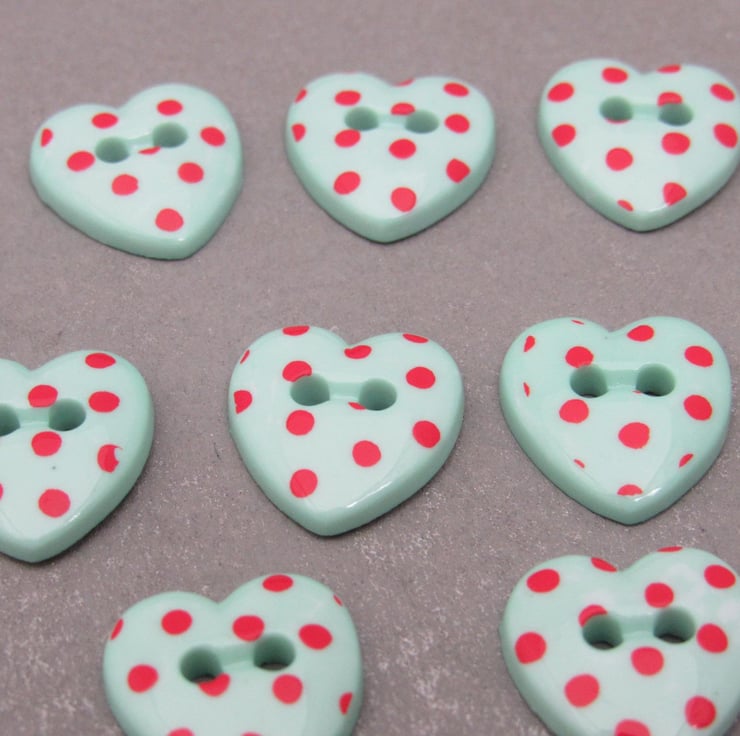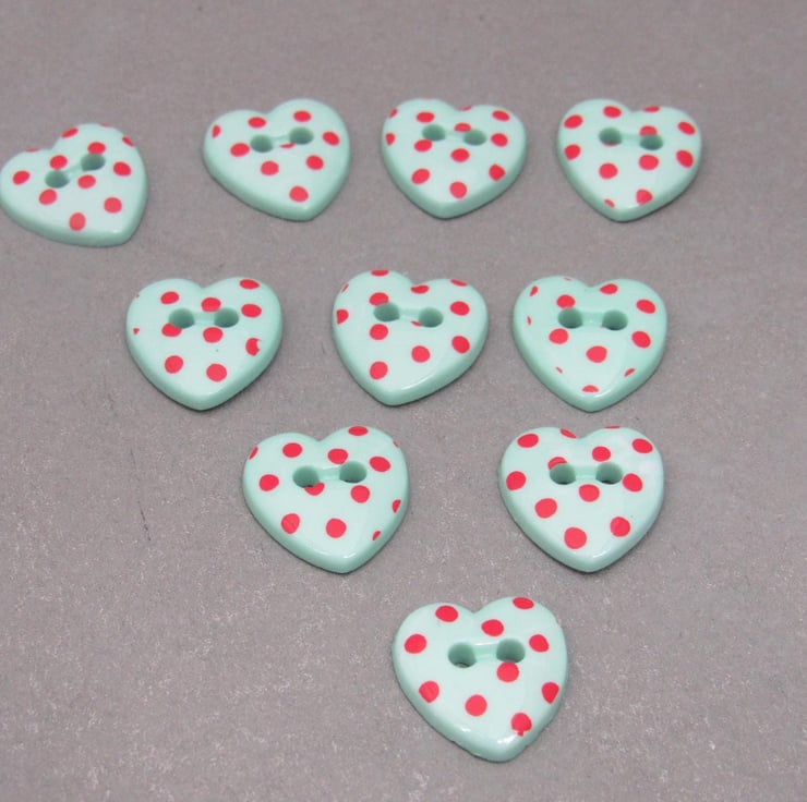 10 small heart shaped green plastic buttons, spotted with red.