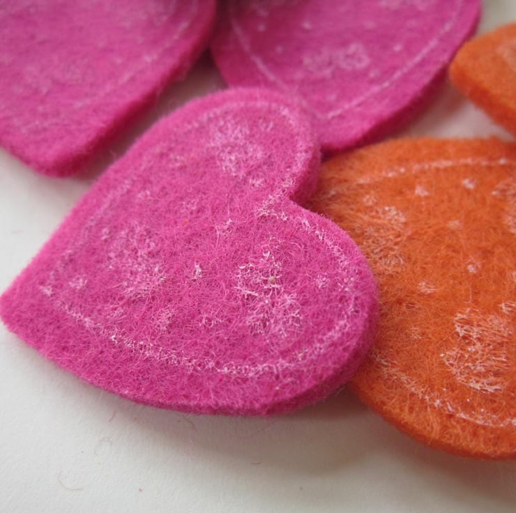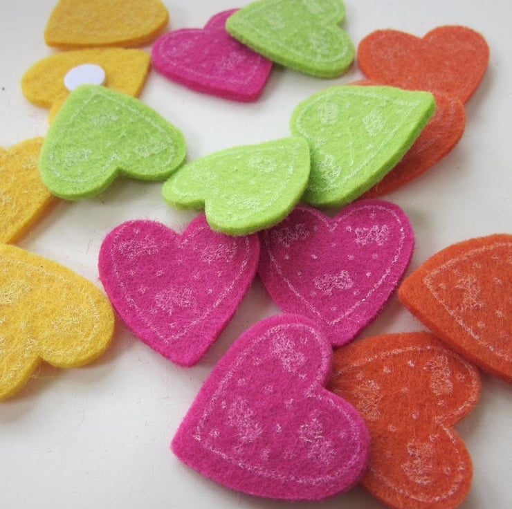 Hot pink, lime green, citrus yellow and orange thick felt hearts each with a printed pattern on the front face