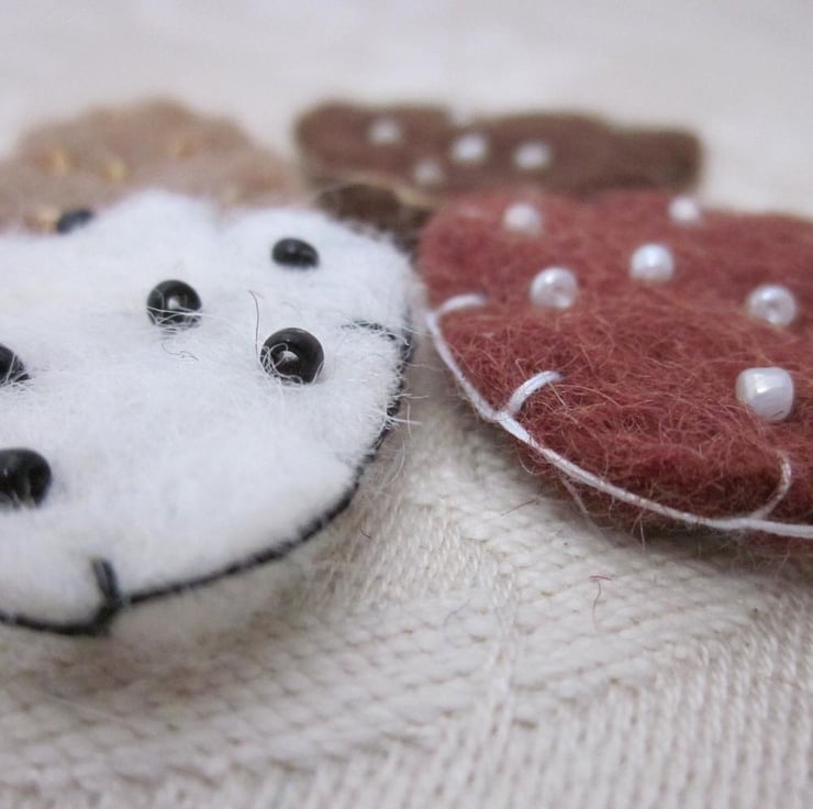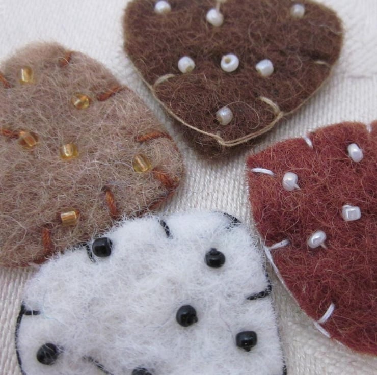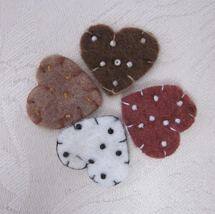 4 brown and fawn beaded felt heart shapes, for cards or sewing.