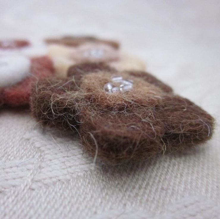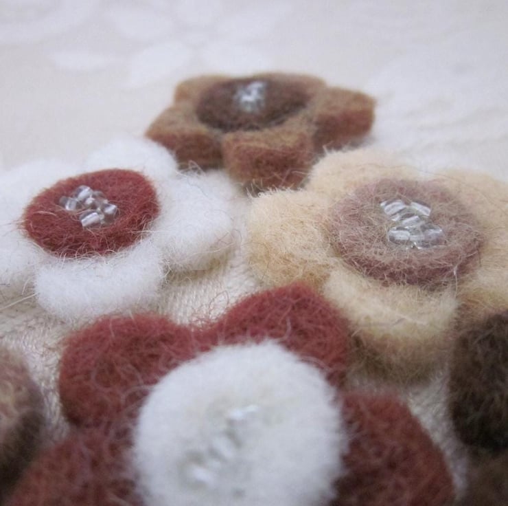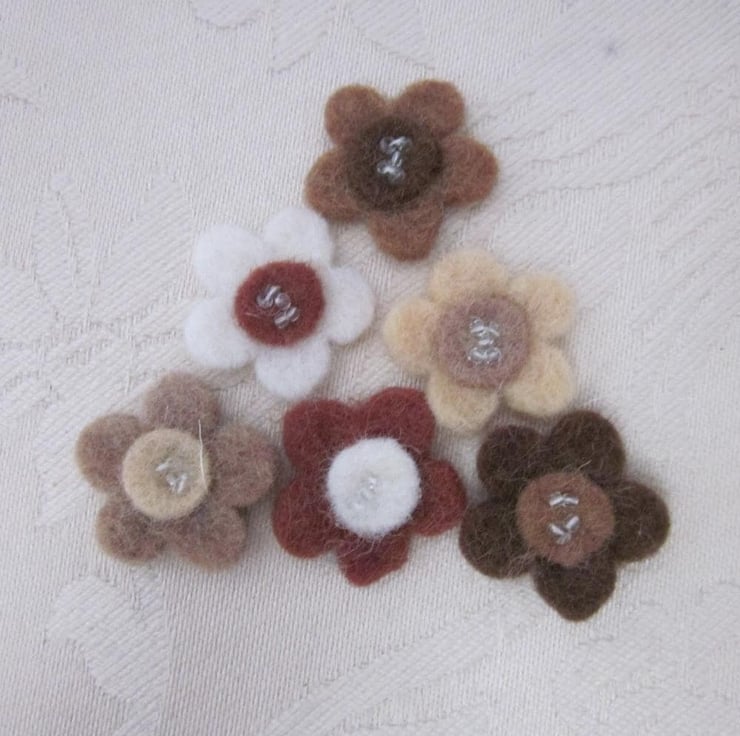 6 brown and fawn beaded felt flower shapes, for cards or sewing.