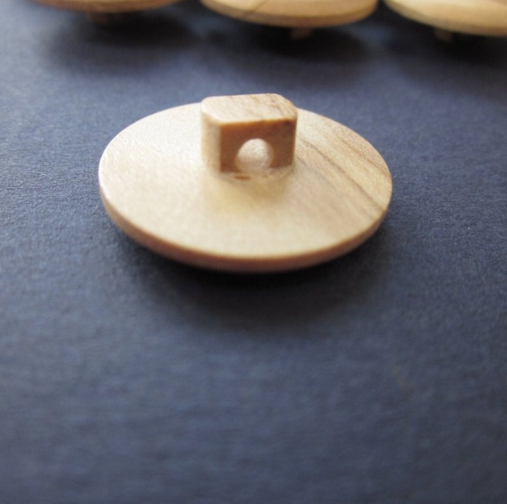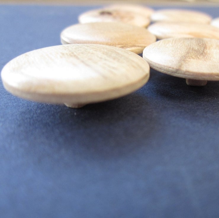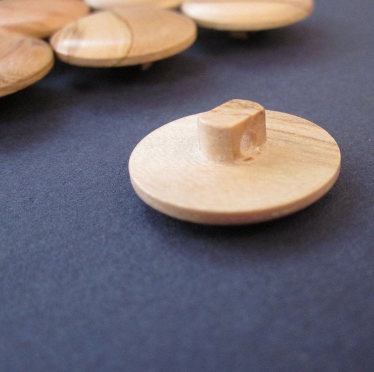 Buttons have a smooth, slightly curved face. On the reverse is a small wooden shank, of a piece with the front face.