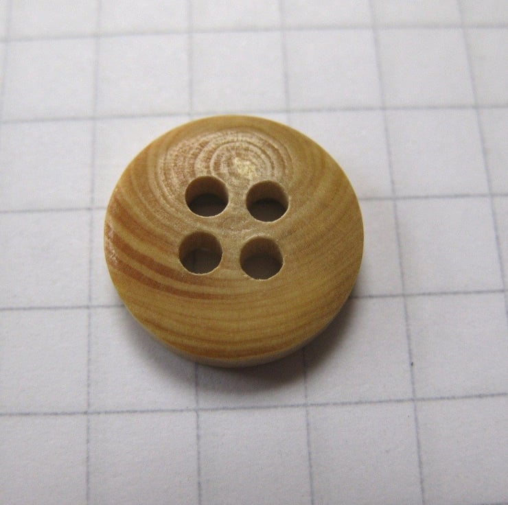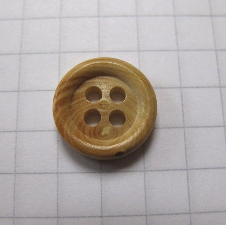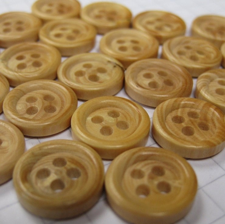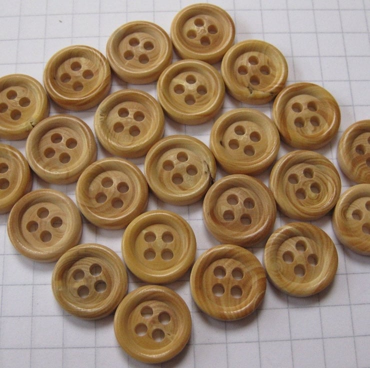 25 tiny plastic buttons, moulded and dyed to look like carved wood. Raised tim, slightly curved reverse.